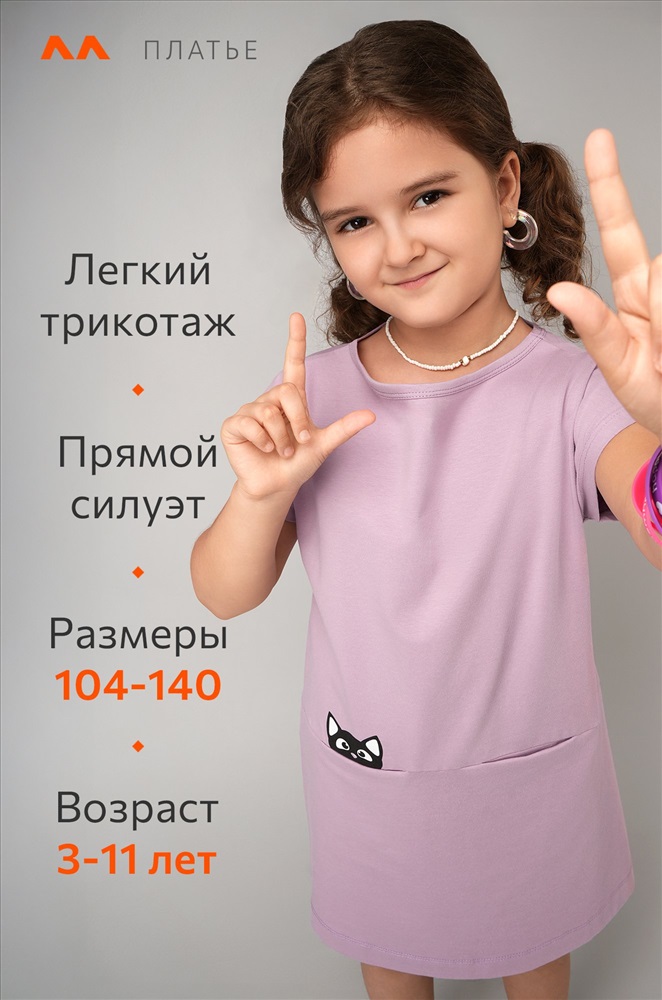 Мягкое, удобное и милое — платье с принтом Котик подарит комфорт и радостное настроение каждый день! Лиловое трикотажное платье для девочки станет любимым нарядом для прогулок и приключений.