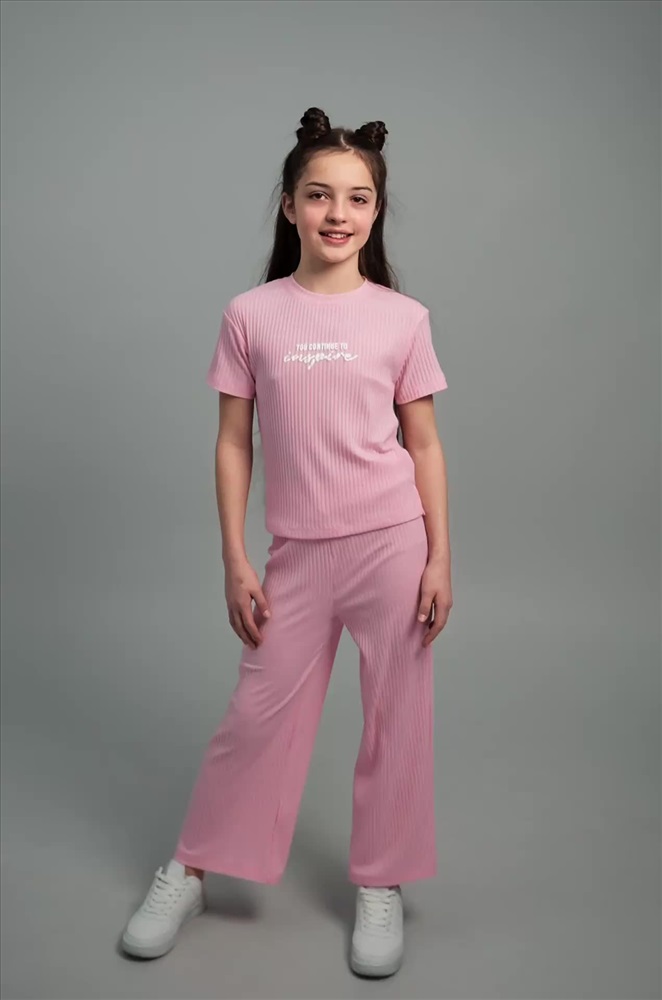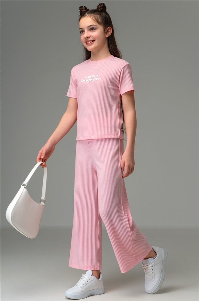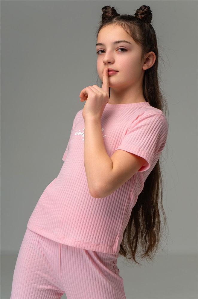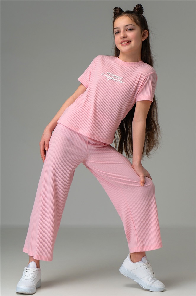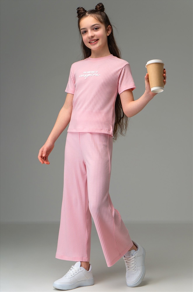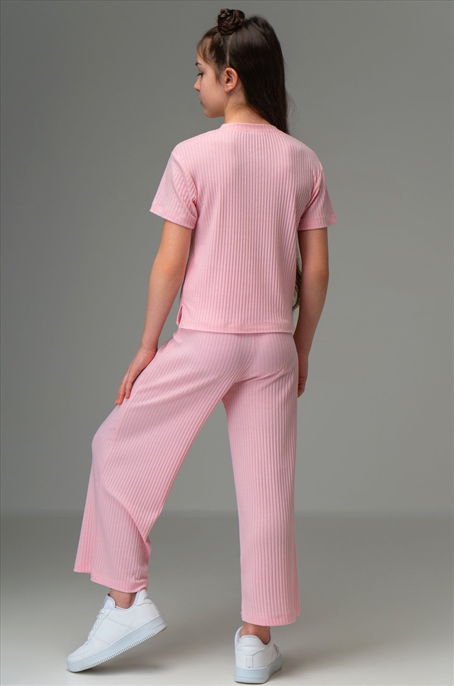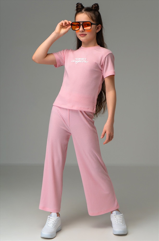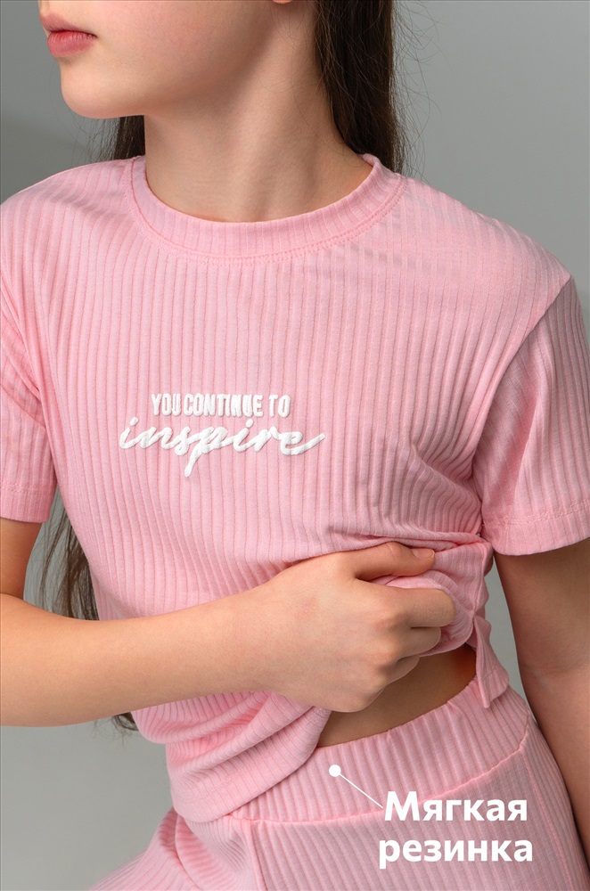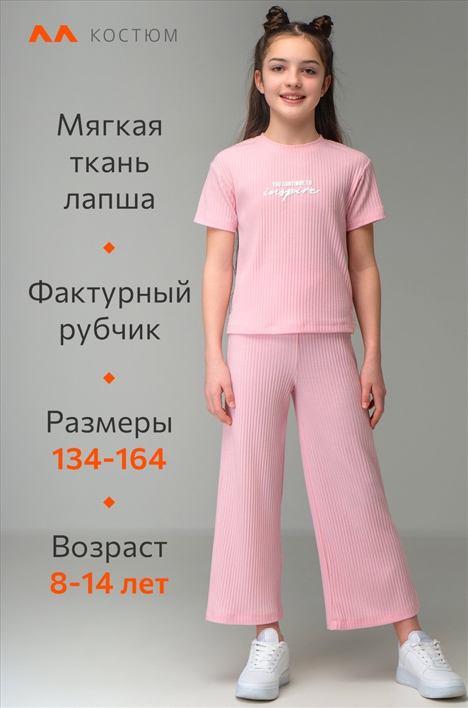 Розовый костюм в рубчик для девочки и девочки подростка выполнен из фактурной ткани лапша. Трикотаж – легкий и дышащий, в нем будет комфортно даже в самый жаркий день. Детский летний костюм с брюками отлично держит форму, не вытягивается в коленях, а нежный розовый цвет сохраняет яркость даже после многочисленных стирок.