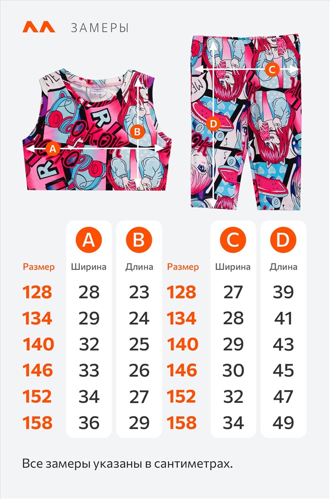 Размер 128: топ: длина:23 см; ширина:28 см.