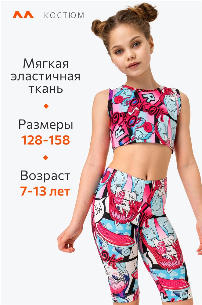 Хлопковый набор из велосипедок и топика подходит для танцев и тренировок по бегу и гимнастике. Облегающий костюмчик станет отличным решением для физкультуры в школе. Подростковый комплект идеален для дома, отдыха и домашних дел.