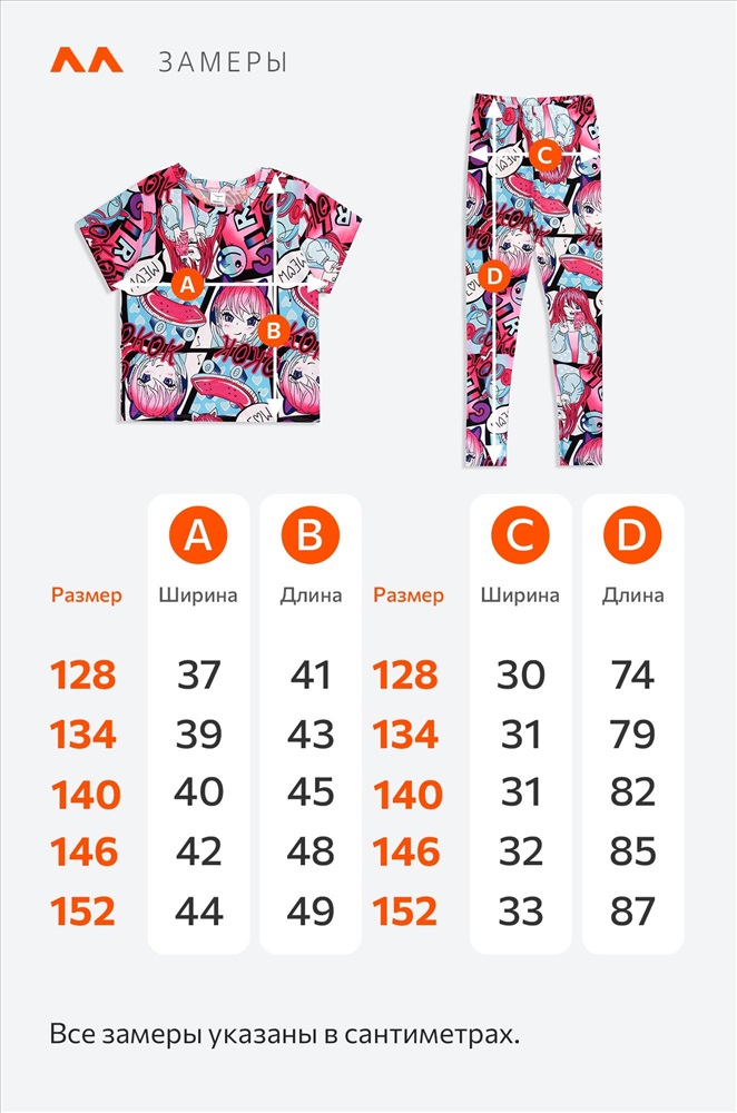 Футболка: длина: 41 см; ширина: 37 см; длина рукава внешняя: 13 см; длина рукава внутренняя: 6 см. Лосины: длина внеш. шва: 74 см; длина внут. шва: 53 см; ширина по бедрам: 30 см. Размер 134: Футболка: длина: 43 см; ширина: 39 см; длина рукава внешняя: 14 см; длина рукава внутренняя: 6 см. Лосины: длина внеш. шва: 79 см; длина внут. шва: 57 см; ширина по бедрам: 31 см. Размер 140: Футболка: длина: 45 см; ширина: 40 см; длина рукава внешняя: 15 см; длина рукава внутренняя: 7 см. Лосины: длина внеш. шва: 82 см; длина внут. шва: 63 см; ширина по бедрам: 31 см. Размер 146: Футболка: длина: 48 см; ширина: 42 см; длина рукава внешняя: 15 см; длина рукава внутренняя: 7 см. Лосины: длина внеш. шва: 85 см; длина внут. шва: 64 см; ширина по бедрам: 32 см. Размер 152: Футболка: длина: 49 см; ширина: 44 см; длина рукава внешняя: 16 см; длина рукава внутренняя: 8 см. Лосины: длина внеш. шва: 87 см; длина внут. шва: 66 см; ширина по бедрам: 33 см. *замеры выборочные, могут незначительно отличаться. Комментарии к товару