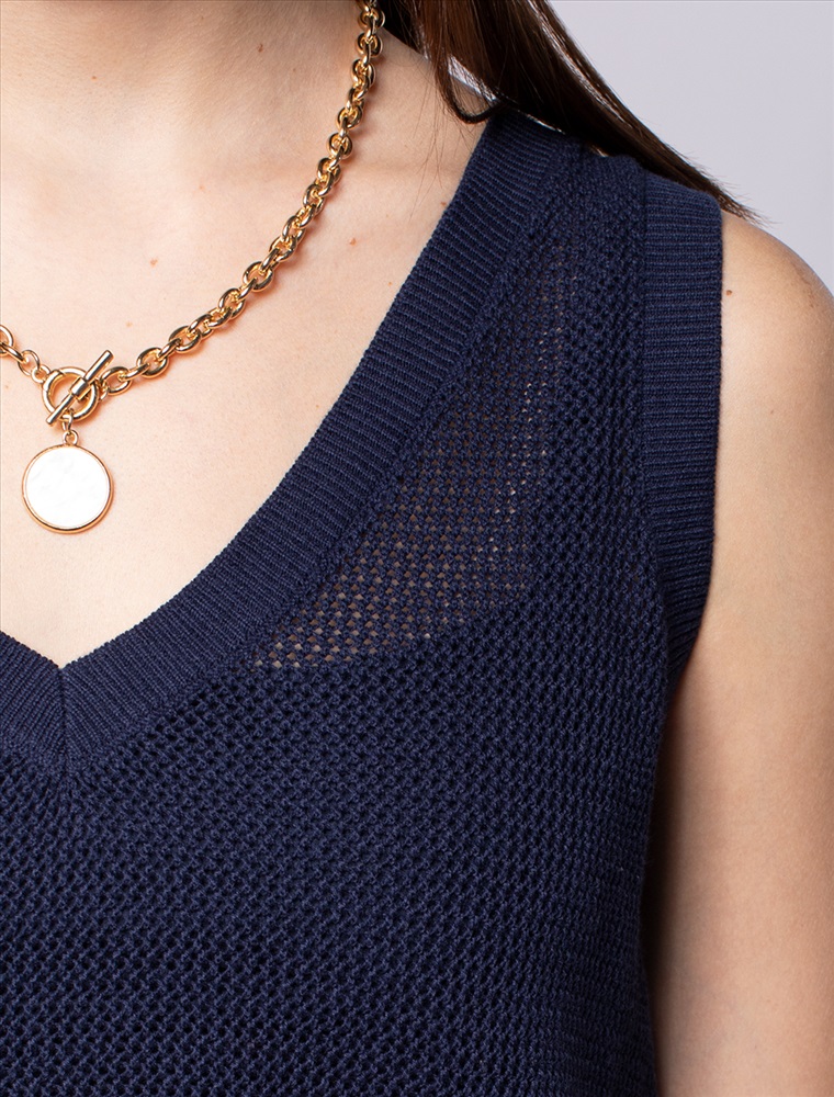 Летний топ полупрозрачной вязки выполнен из хлопковой пряжи. Идеально подойдет в жару, с мини-топом или в сочетании с купальником. Также отлично впишется в многослойные образы с джинсами и жакетом. Модель дополнена металлическим логотипом бренда.