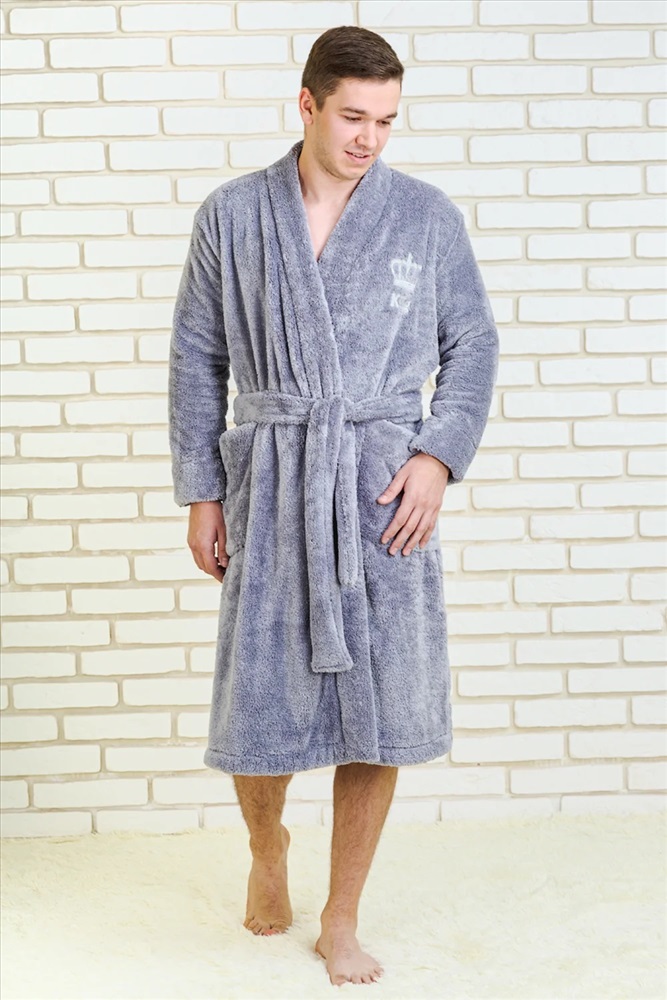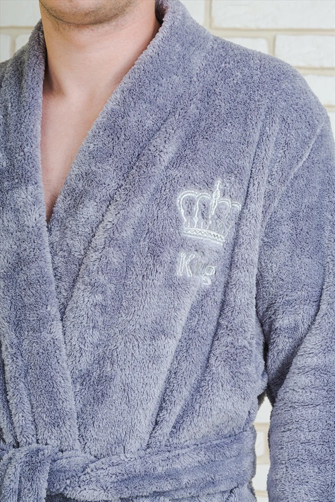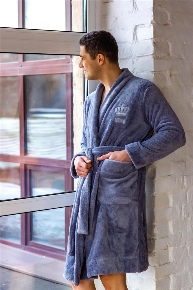 Мужской халат с поясом на запах. Длина изделия ниже колена, с двумя удобными карманами, рукав длинный. Приятный к телу халат окутает своим теплом и подарит хорошее настроение каждому «Королю». На полочке выбит соответствующий принт «Король».