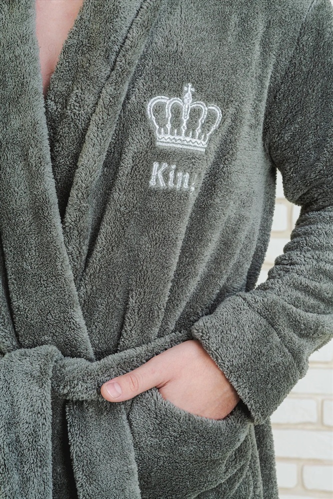 Мужской халат с поясом на запах. Длина изделия ниже колена, с двумя удобными карманами, рукав длинный. Приятный к телу халат окутает своим теплом и подарит хорошее настроение каждому «Королю». На полочке выбит соответствующий принт «Король».