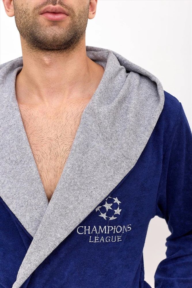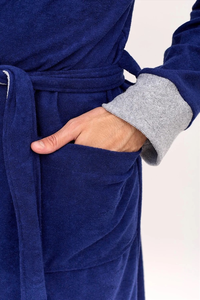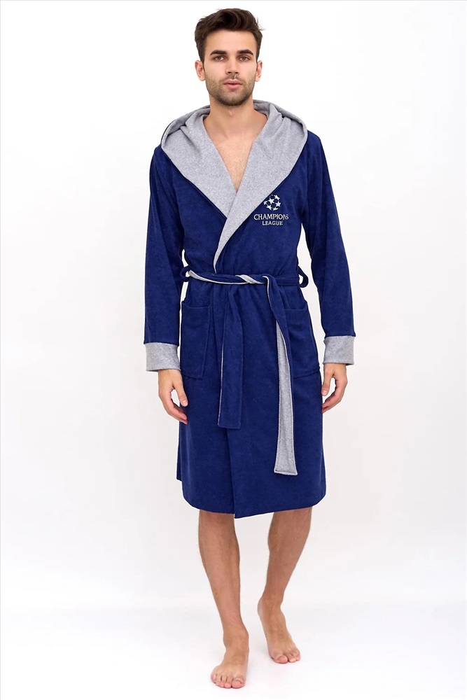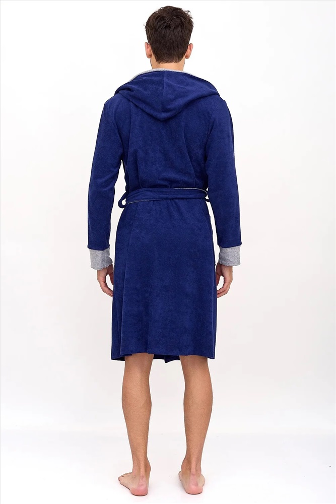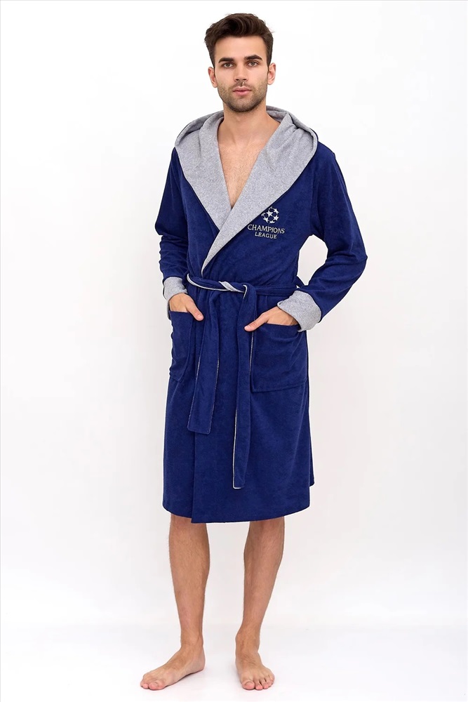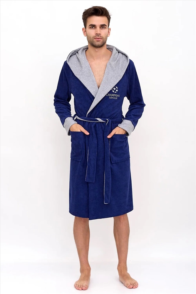 Махровый домашний мужской халат для отдыха и после водных процедур. Красивый и стильный халат с капюшоном, накладными карманами, манжетами и креплением на пояс. Необходимая вещь после трудных рабочих будней, в нем также можно с комфортом отдохнуть и расслабиться после бани или душа.