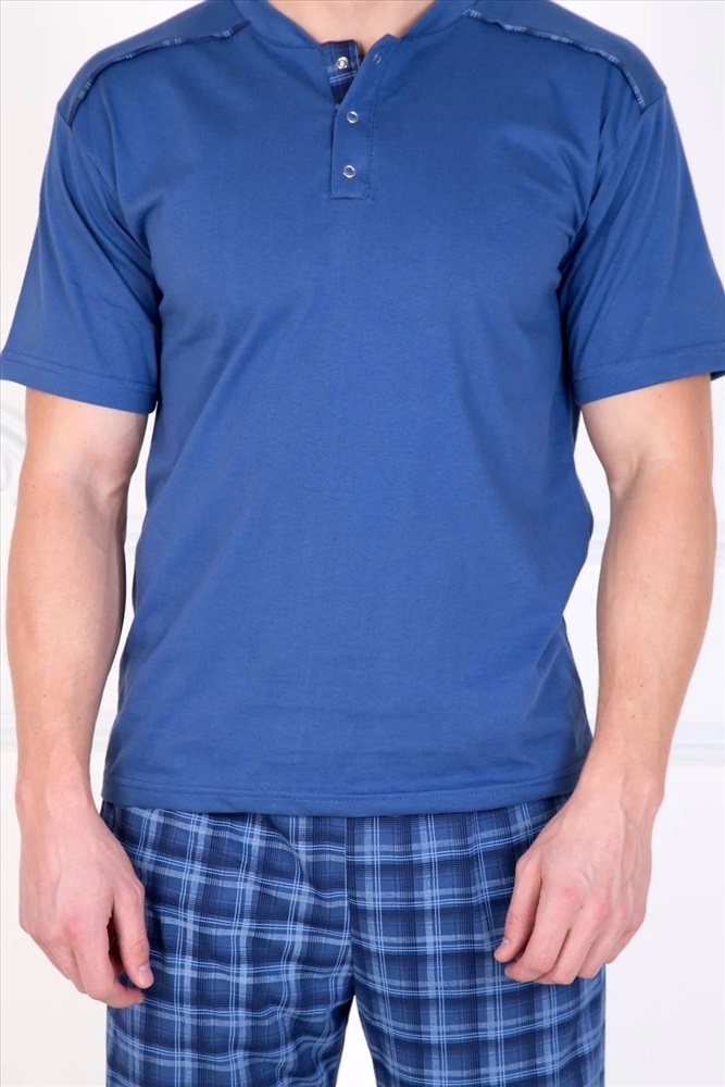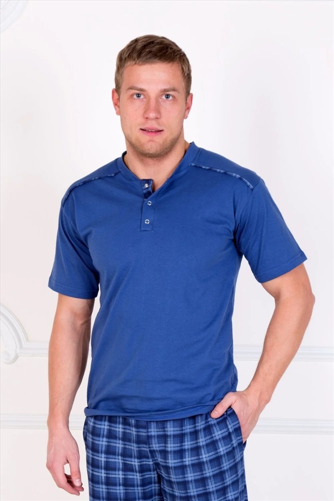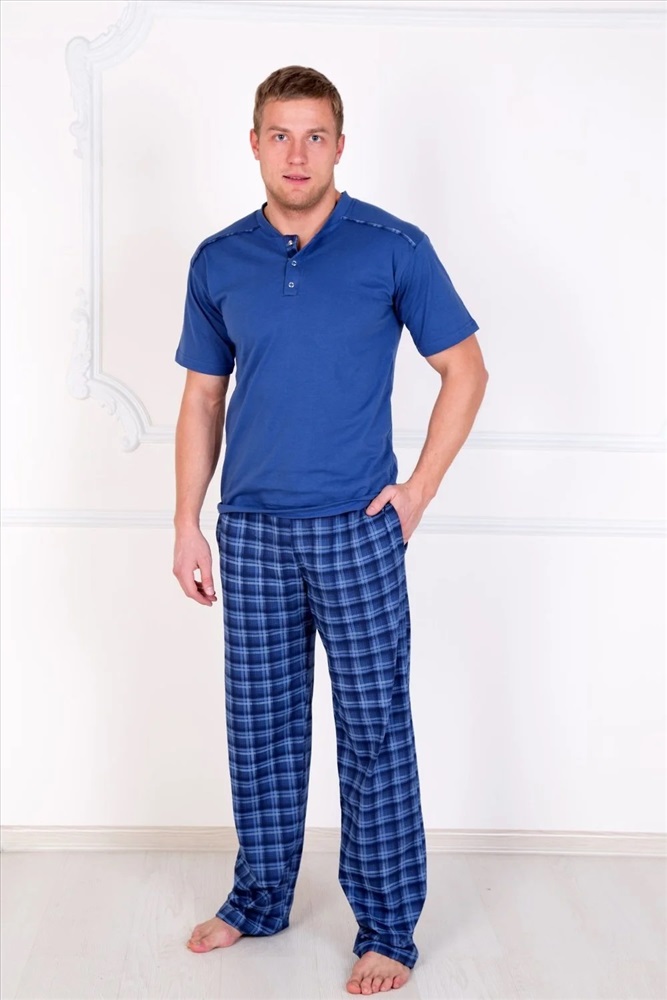 Костюм Клетка – выбор уверенных в себе мужчин.Футболка,цвета индиго, которая декорирована кнопками, в сочетании со штанами в клетку – возможность получить комфорт и создать стильный образ в любой обстановке, будь вы дома или на отдыхе. Высокое качество, полный размерный ряд – к чему сомнения?