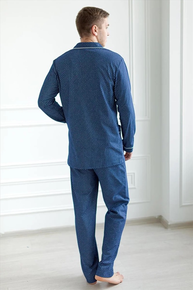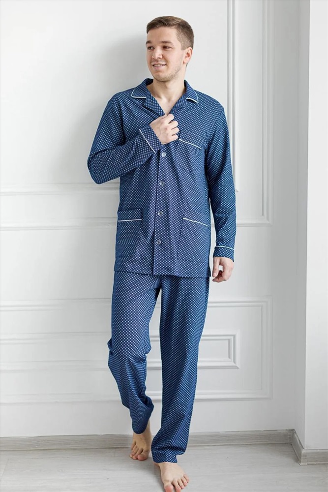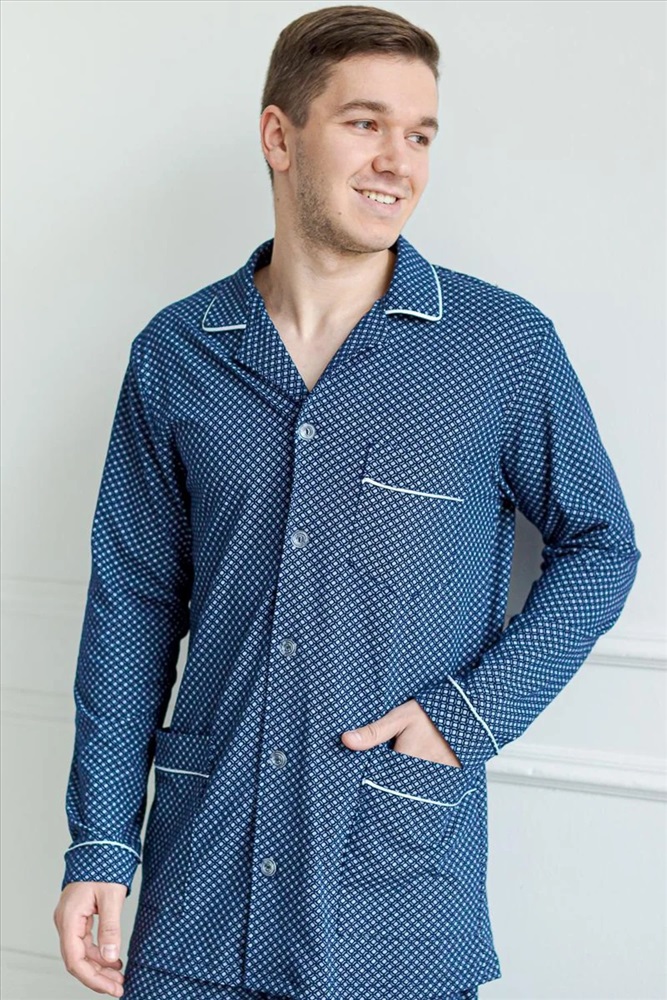 Мужская пижама из 100% хлопка, приятная к телу и не сковывает движений. В комплекте рубашка на пуговицах и с удобными карманами, так же прямые свободные брюки на поясной резинке. Рисунок на ткани в мелкую клетку. Отличный комплект, выполненный со вкусом, подойдёт каждому мужчине.
