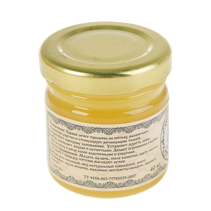 Состав: воск пчелиный, мёд натуральный кавказский, масло облепиховое, масло лещины, масляные экстракты шалфея, зверобоя, ромашки.