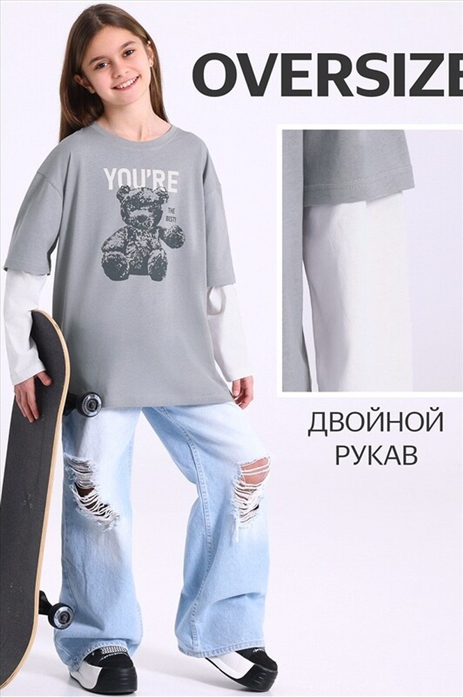 Лонгслив для девочки выполнен из кулира - тонкого хлопкового полотна. Изделие свободного силуэта, со спущенными плечами и двойными рукавами, Полочка украшена печатью. Уход: только машинная стирка (руками не стирать!) при температуре 40 градусов, без предварительного замачивания. Изделия с печатью перед стиркой необходимо вывернуть на изнаночную сторону.