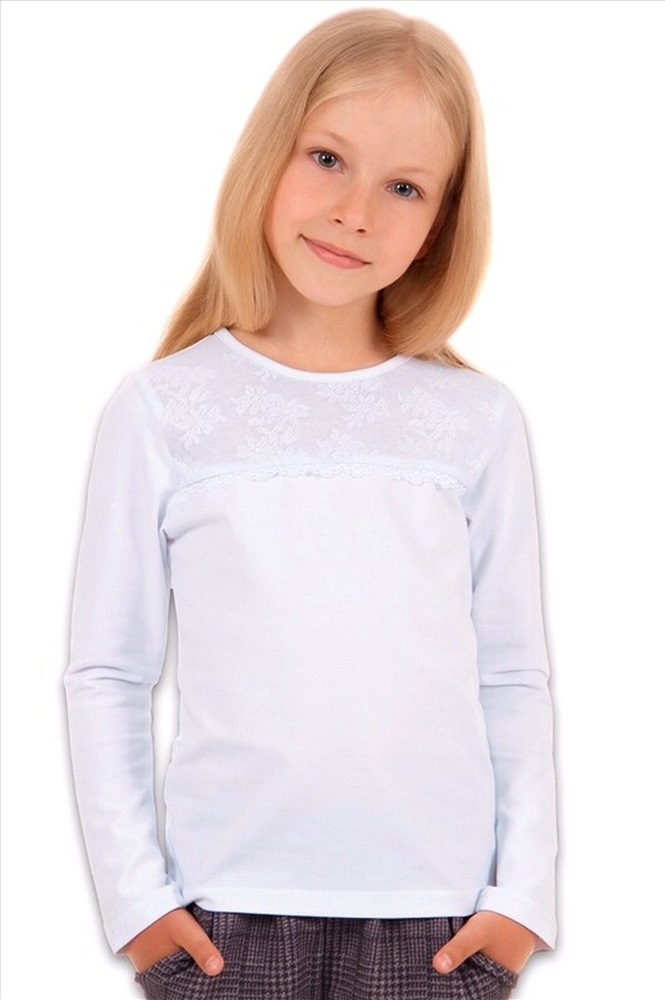 Лонгслив для девочки выполнен из кулира - легкого хлопкового полотна с лайкрой. Изделие с длинными рукавами, украшено кружевной кокеткой. Отличный вариант для школьницы на каждый день! Уход: только машинная стирка (руками не стирать!) при температуре 40 градусов, без предварительного замачивания. Тип полотна - кулир с лайкрой