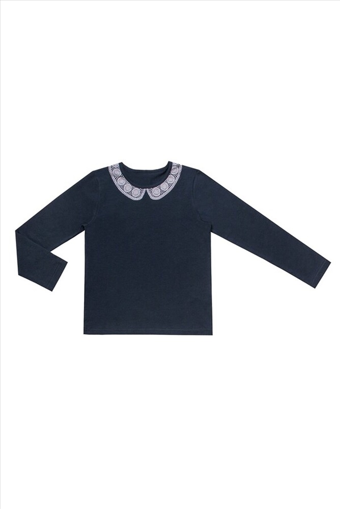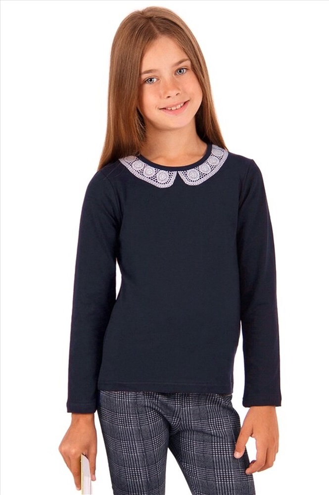 Лонгслив для девочки выполнен из кулира - легкого хлопкового полотна с лайкрой. Изделие с длинными рукавами, декорировано печатью, имитирующей кружевной воротничок. Незаменимый предмет гардероба для школьниц! Уход: только машинная стирка (руками не стирать!) при температуре 40 градусов, без предварительного замачивания. Изделия с печатью и декором перед стиркой необходимо вывернуть на изнаночную сторону. Материал: кулир с лайкрой