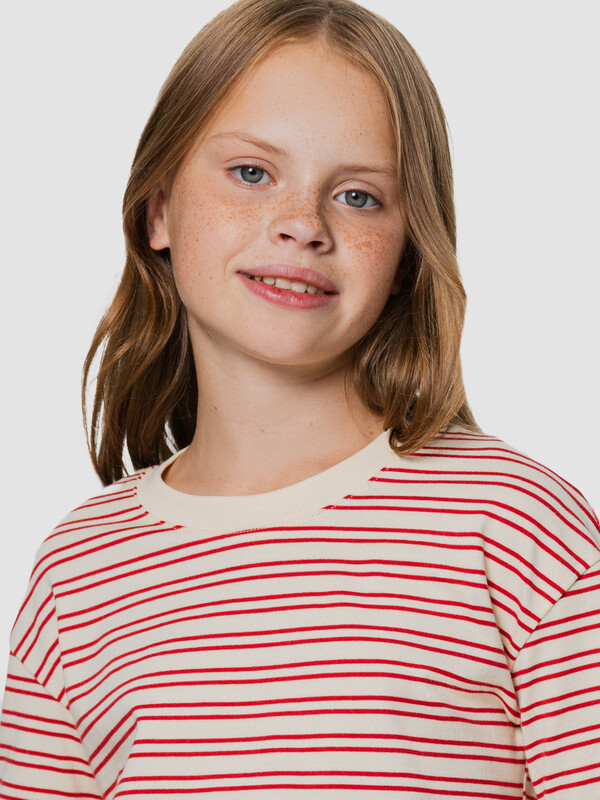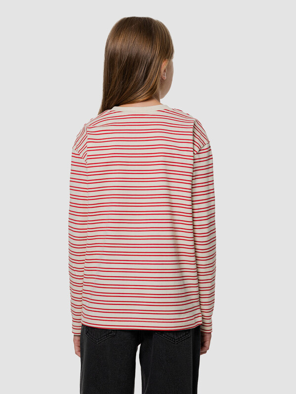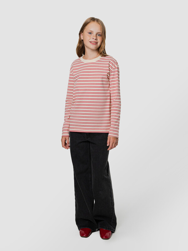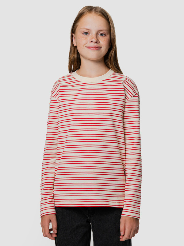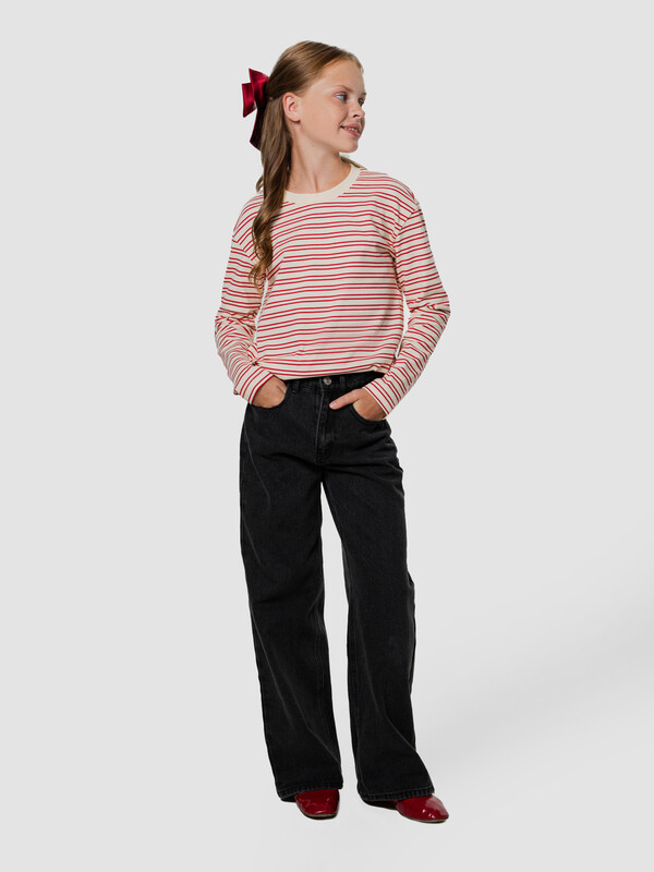 Лонгслив для девочек, прямого силуэта. Горловина округлой формы, из рибаны. Шов втачивания рибаны закрыт бейкой из основного полотна. Плечо спущено, рукав втачной длинный. Низ изделия и рукавов обработан швом в подгибку на двухигольной плоскошовной машине.
