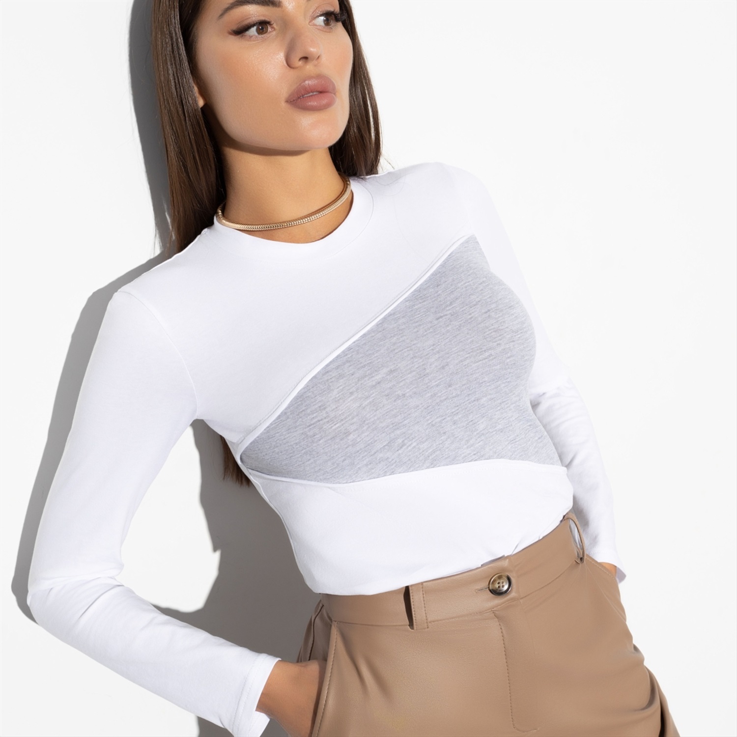 Состав: Трикотаж «кулирка» (97% хлопок, 3% эластан) Плотность ткани: Средняя Тип ткани: Трикотаж Вид застежки: Нет Дополнительный цвет ткани: Серый Карманы: Нет Основной цвет ткани: Белый Отрезная талия: Нет Подклад: Нет Резинка по талии: Нет Рисунок/раппорт: Нет, все изделия идентичны Сезон: Круглогодичный Силуэт: Приталенный Стиль: Повседневный Параметры модели на фото: