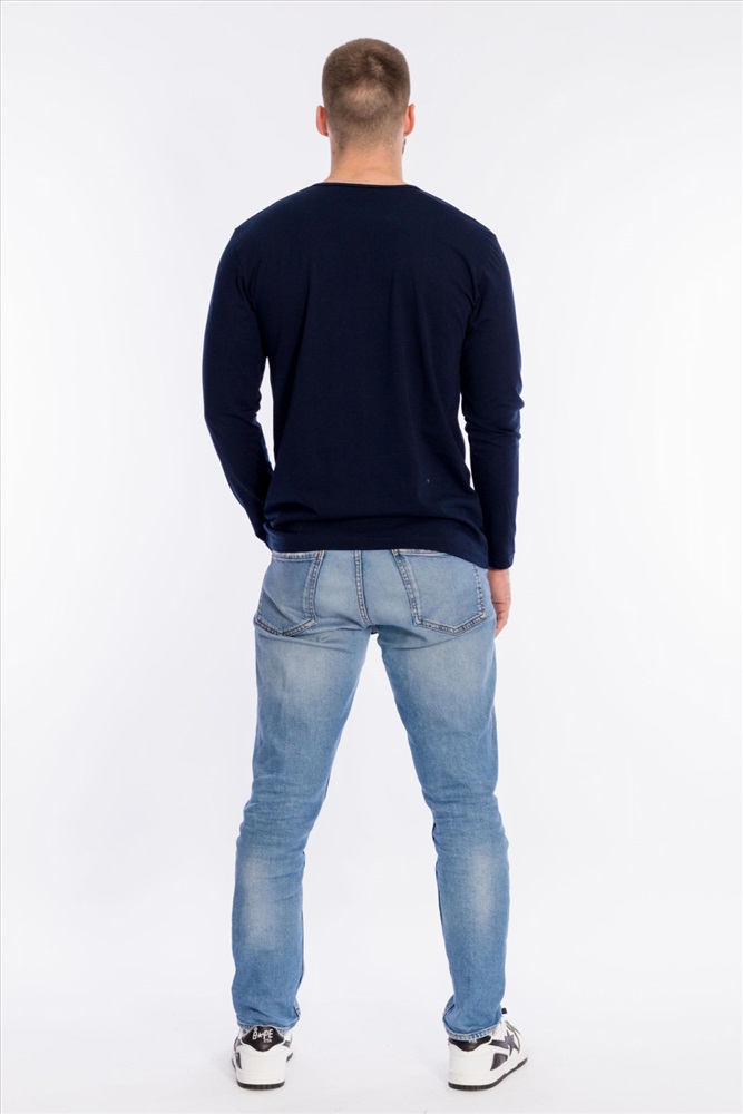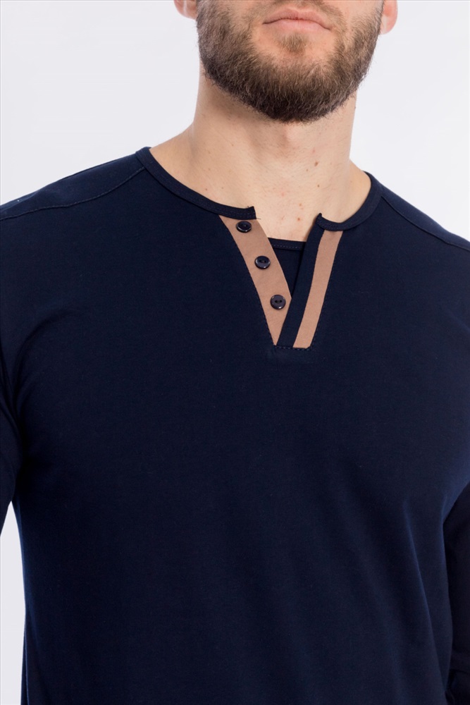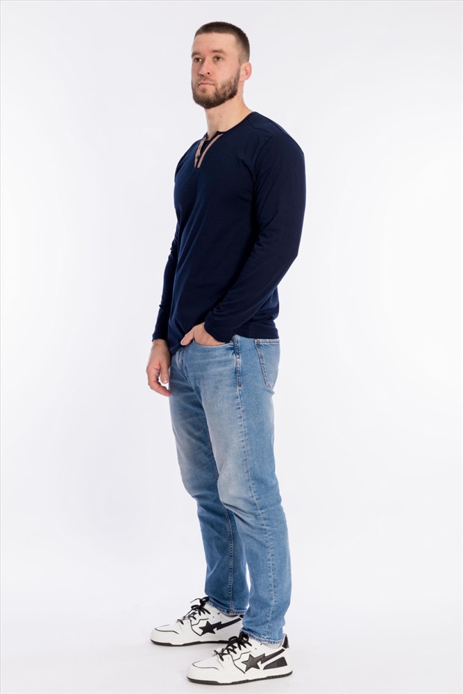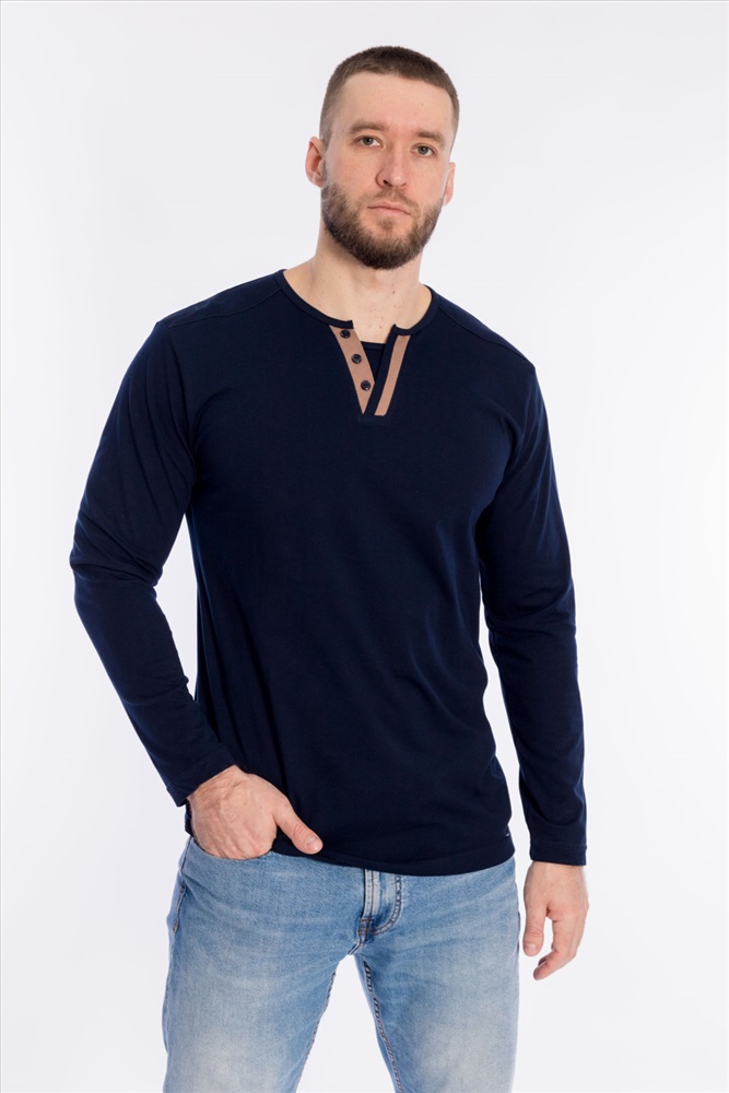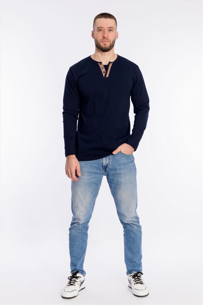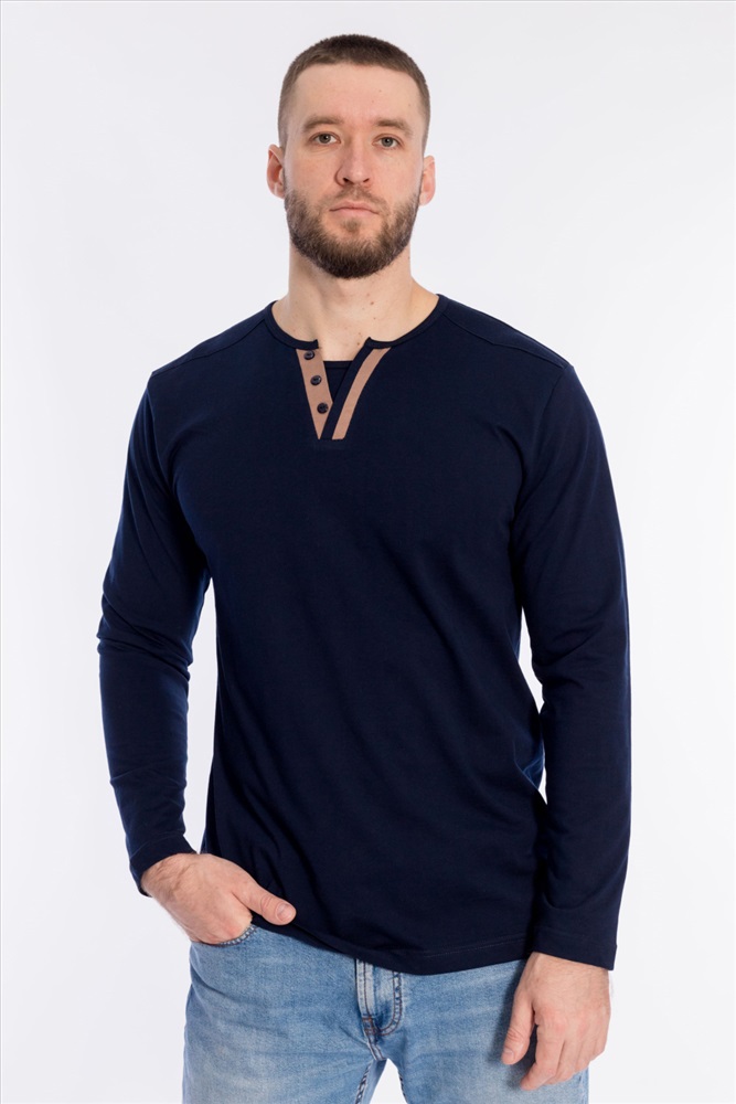 Застежка: Без застежки С капюшоном: Нет С карманами: Нет Сезон: Всесезонный Силуэт: Прямой Состав: Хлопок 100% Цвет Номенклатуры: синий Мужская футболка с длинным рукавом из однотонной кулирки - 100% хлопок. Вырез горловины круглый, в качестве отделки оформлен V-образно планками с пуговицами. Комментарии к товару