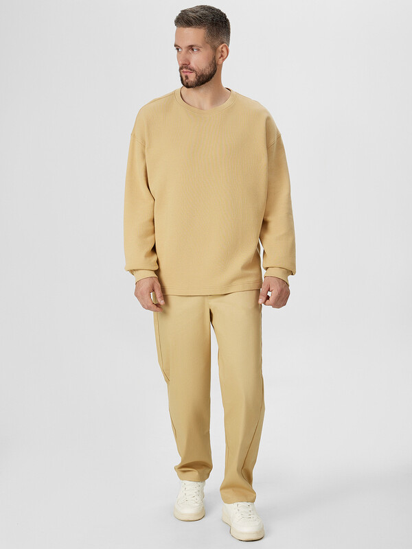 Лонгслив прямой, свободный. Горловина круглой формы с обтачкой из рибаны. Горловина спинки закрыта хб тесьмой (10 мм). Рукав втачной, длинный, с отрезными манжетами из рибаны. Линия плеча слегка спущена. По плечевым швам и швам втачивания рукава проложены отделочные отстрочки. Нижний срез изделия обработан швом вподгибку на 2х игольной плоскошовной машине.