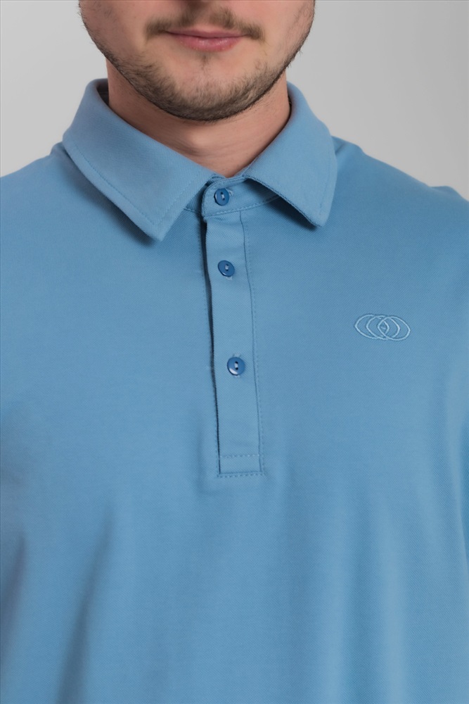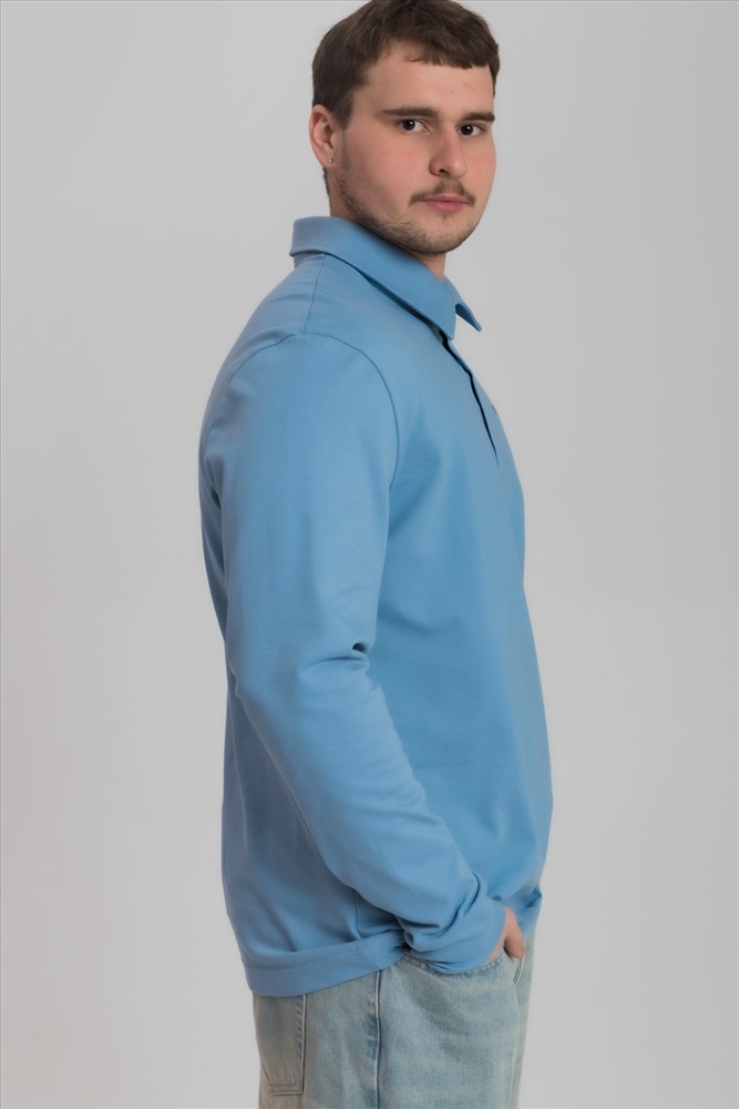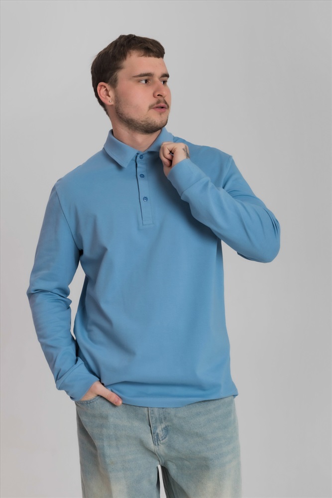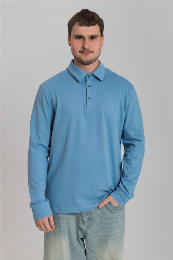 Цвет Номенклатуры: голубой Лонгслив-поло из однотонного пике с втачным рукавом на притачной манжете. Воротник на отрезной стойке. Застежка на полочке на пуговицы. С левой стороны полочки вышивка фирменного логотипа в цвет поло.