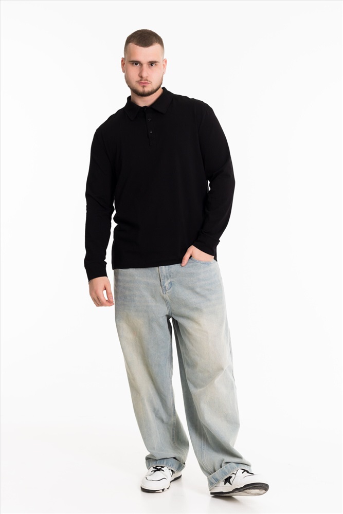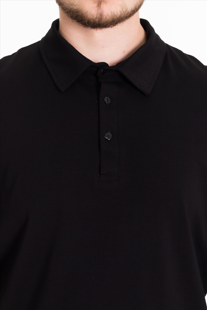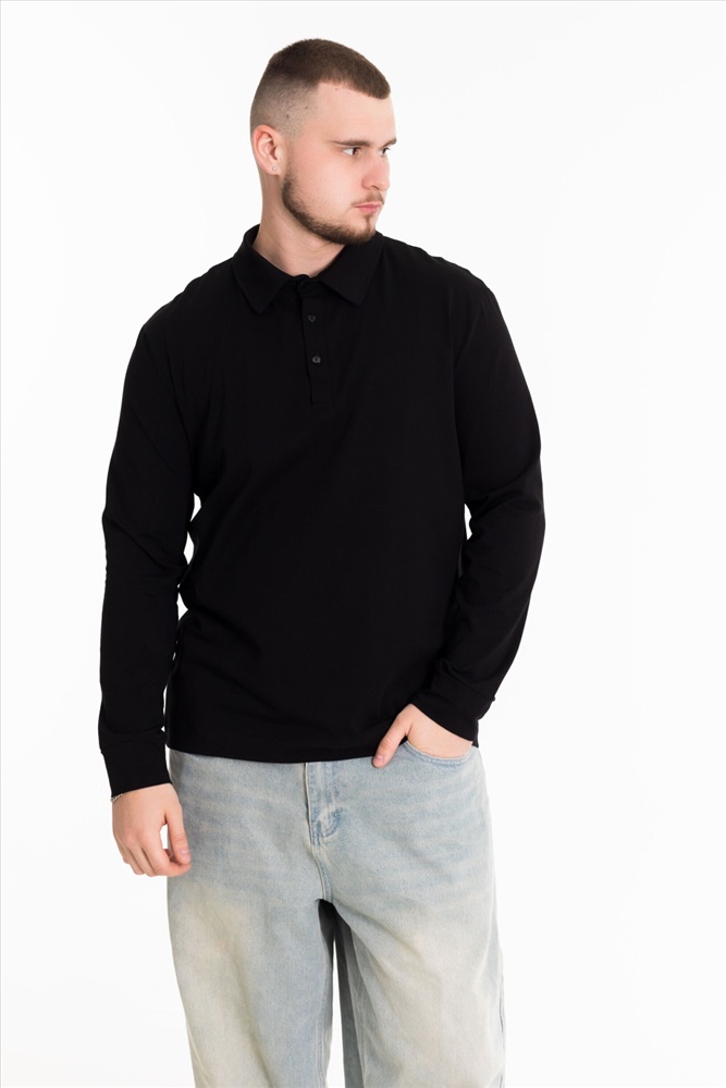 Лонгслив-поло из однотонного хлопкового полотна с добавлением лайкры. Втачной рукав на манжете, воротник на отрезной стойке с застежкой на три пуговицы.