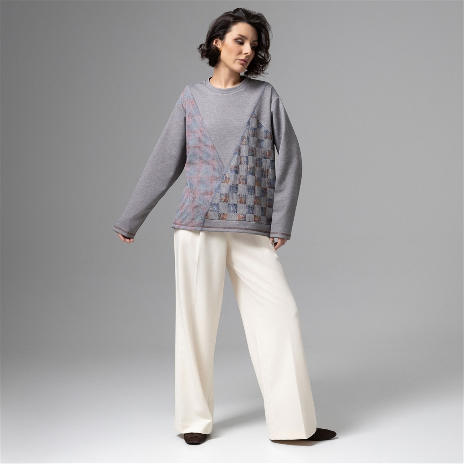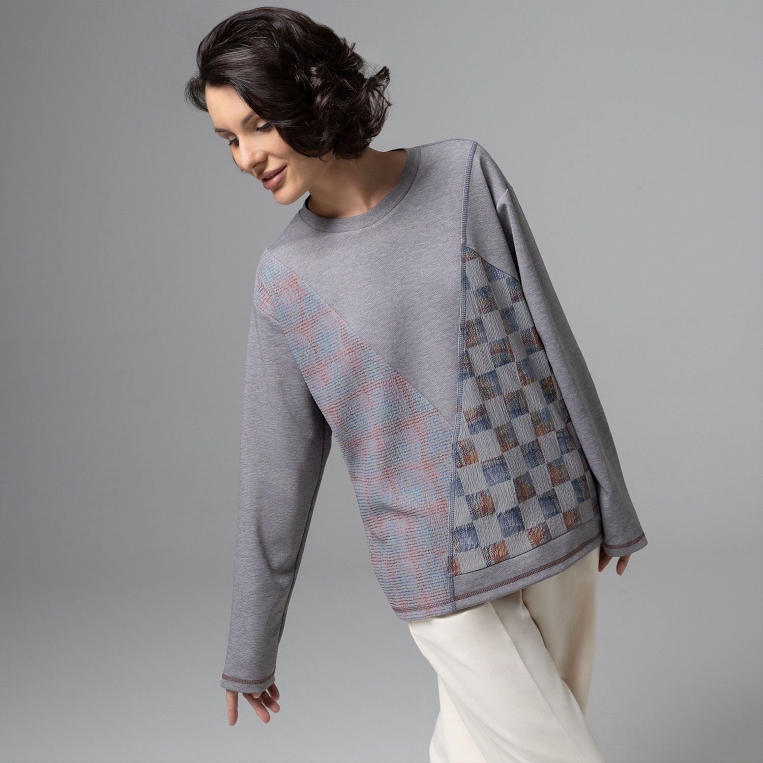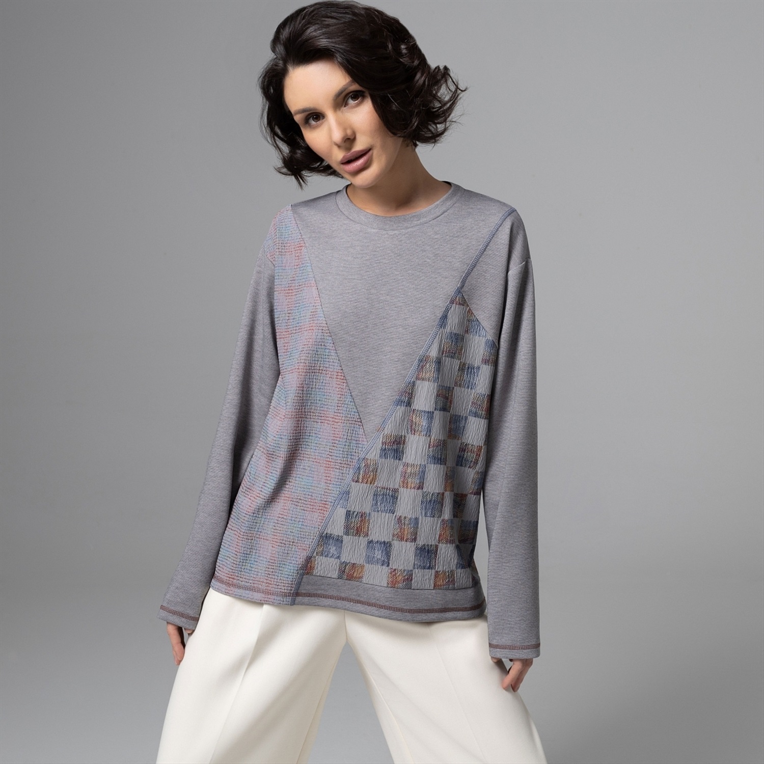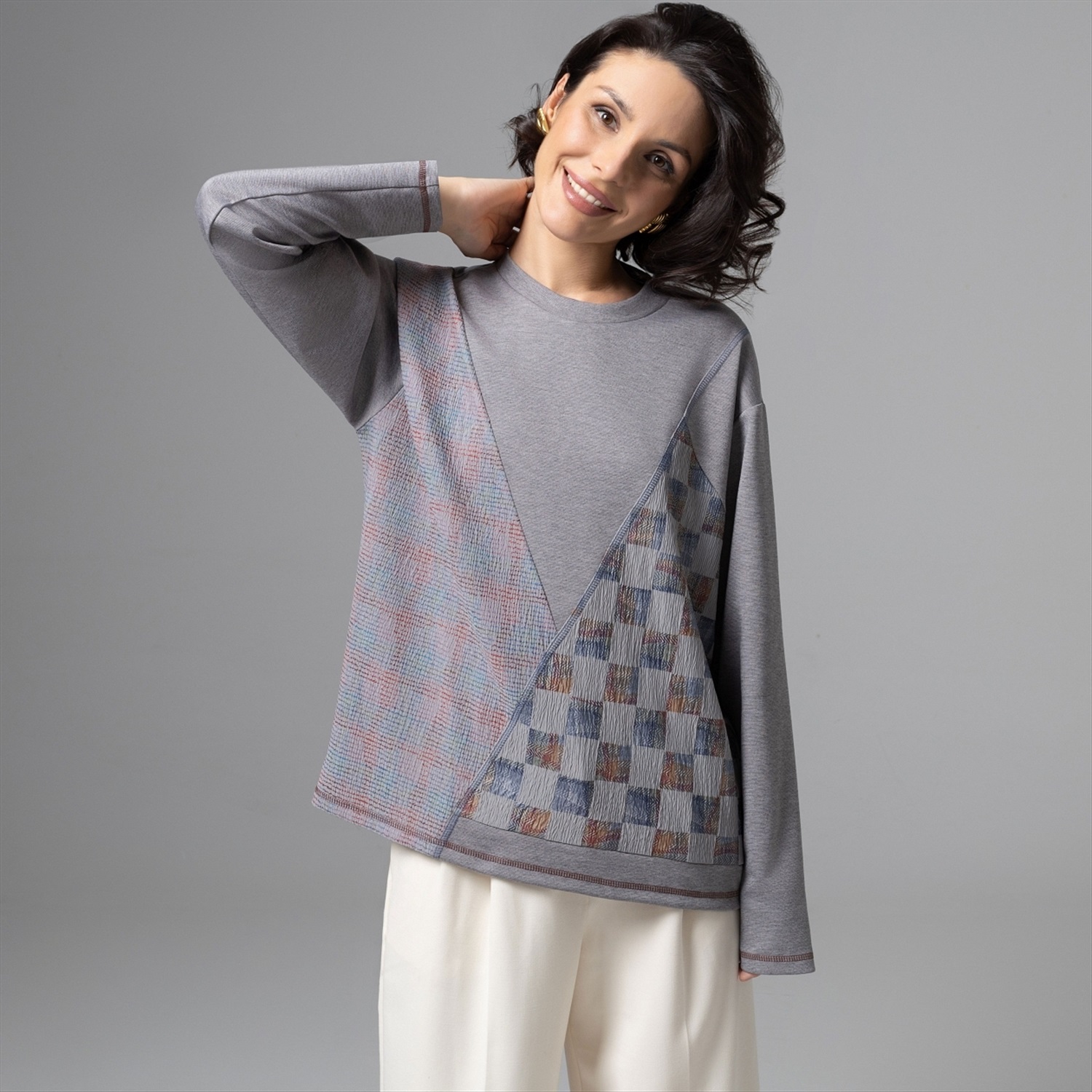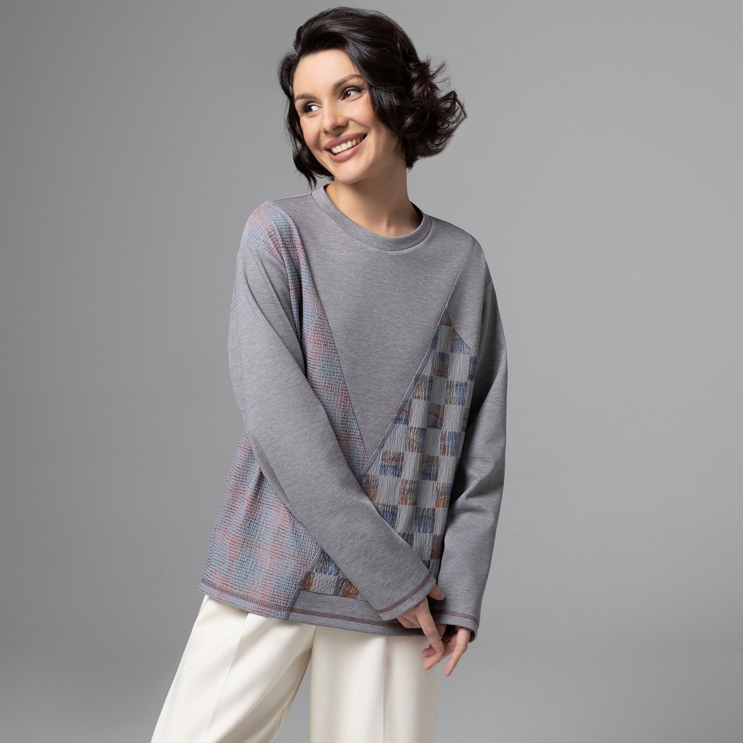 Вещь, которая создаёт стильный образ без усилий. Лонгслив из потрясающе тактильного трикотажа с акцентными асимметричными элементами – так выглядит новый код тихой роскоши. Мягкий серый, сложные фактуры и геометрия делают образ премиальным, но по‑настоящему удобным для жизни – от арт-пространств до путешествий. Диагональные и клетчатые вставки визуально стройнят и маскируют зону живота. Универсальный серый оттенок отлично миксуется и подходит разным цветотипам. Комментарии к товару