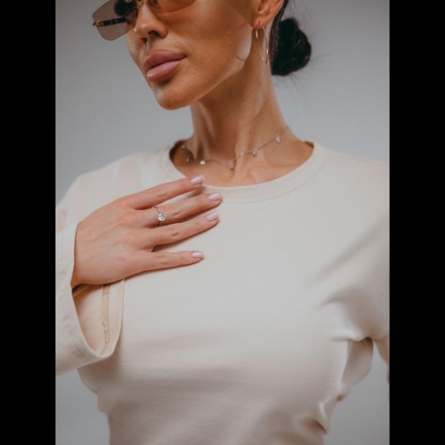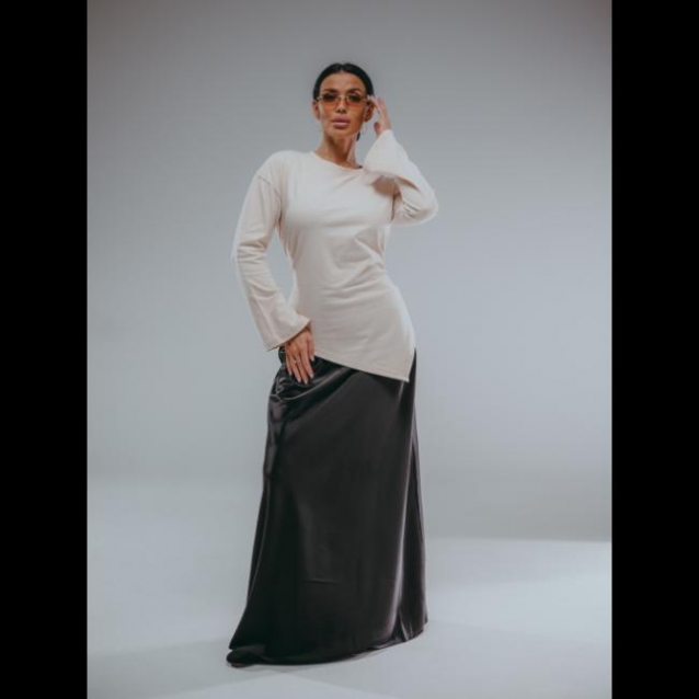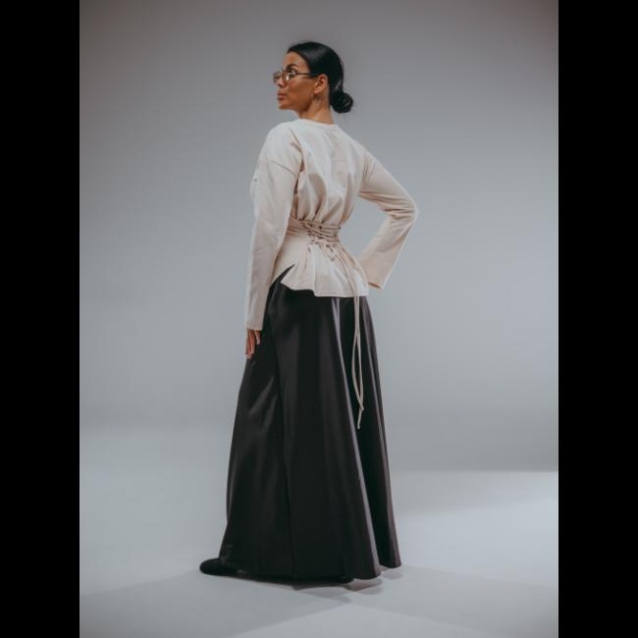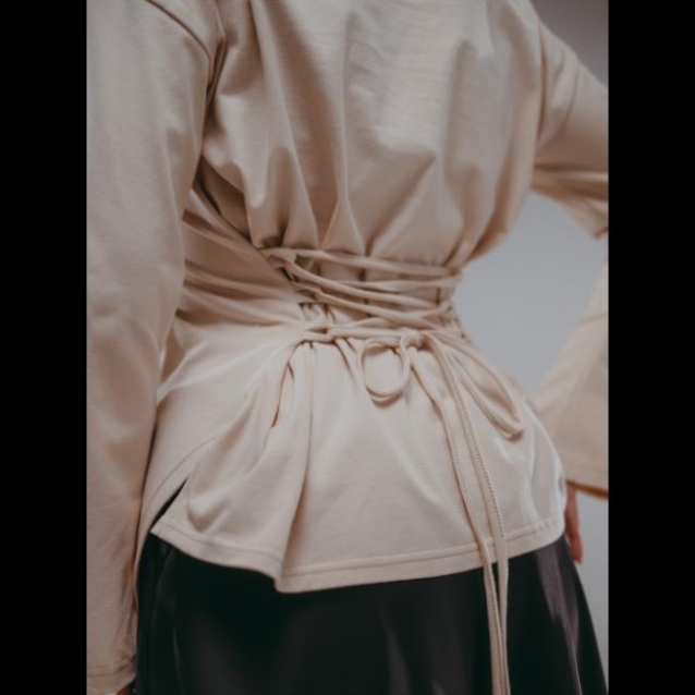 Лонгслив приталенного силуэта со шнуровкой из окантовки на спинке, с длинным расклешенным к низу рукавом, низ ассиметричной геометрической формы.