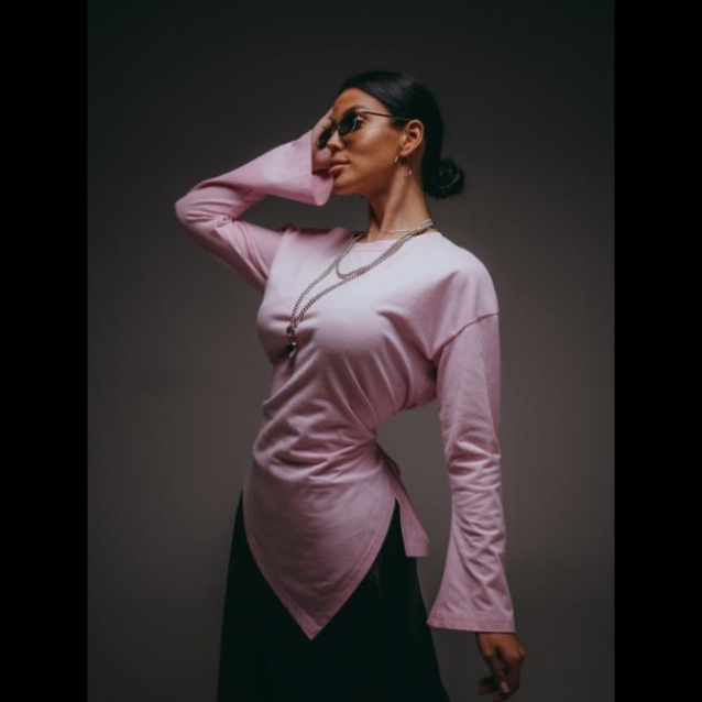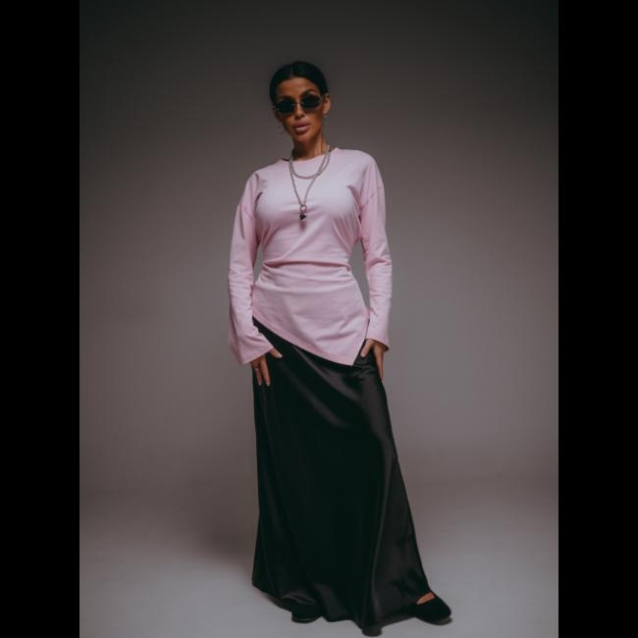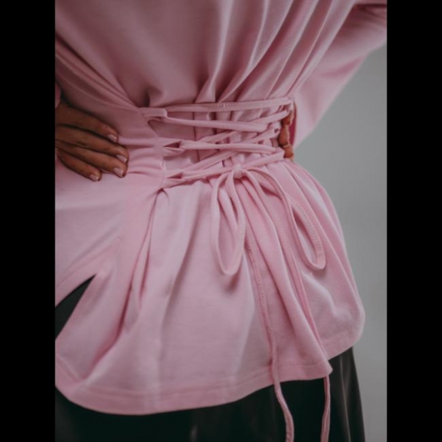 Лонгслив приталенного силуэта со шнуровкой из окантовки на спинке, с длинным расклешенным к низу рукавом, низ ассиметричной геометрической формы.