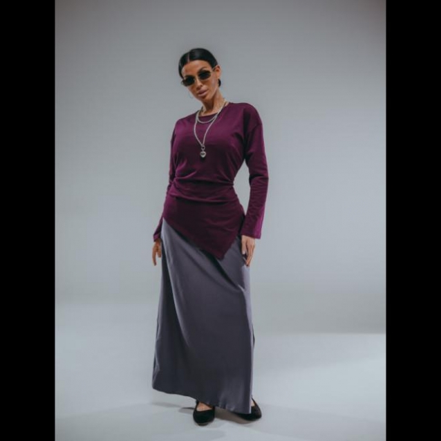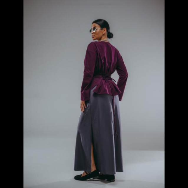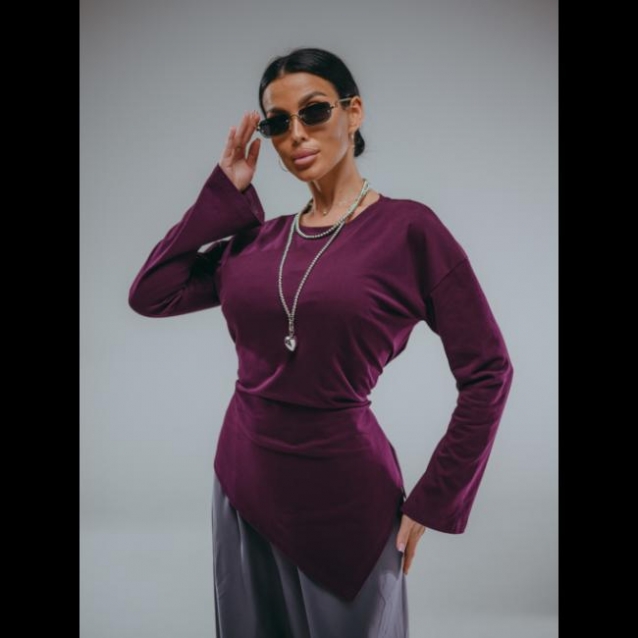 Лонгслив приталенного силуэта со шнуровкой из окантовки на спинке, с длинным расклешенным к низу рукавом, низ ассиметричной геометрической формы.