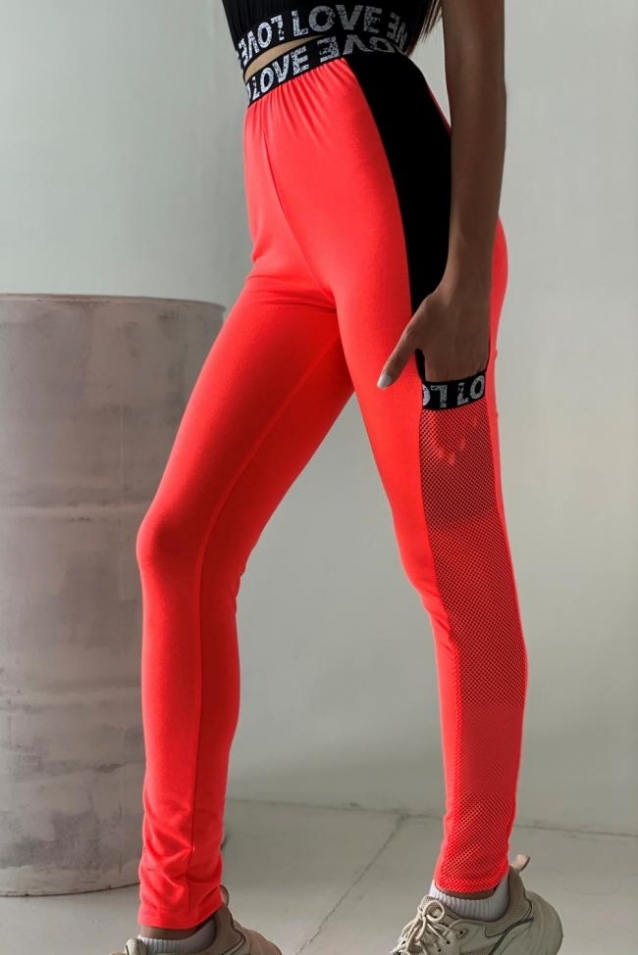 Лосины облегающие, длинные, сверху на декоративной резинке. Вдоль боковых швов расположен лампас из отделочного полотна и сетки. В средней части лампаса обработан карман.