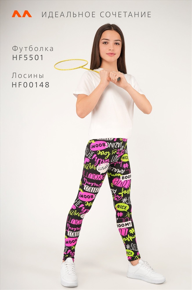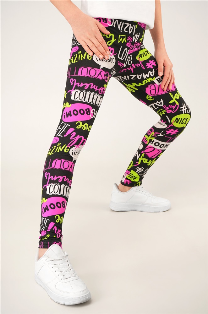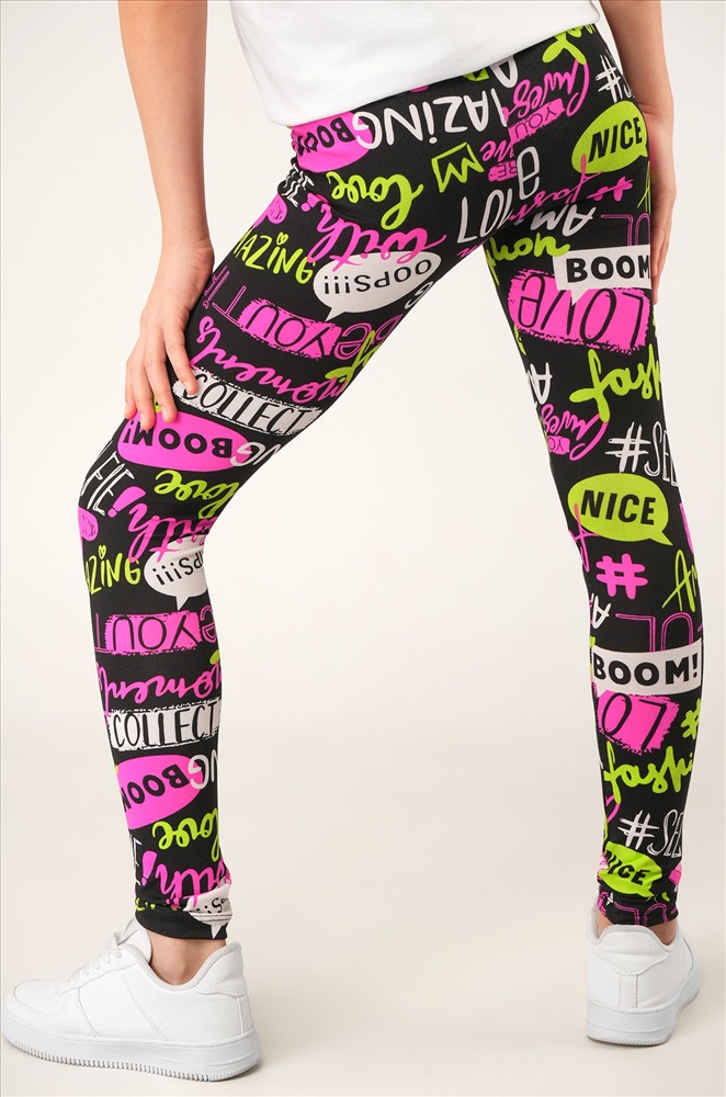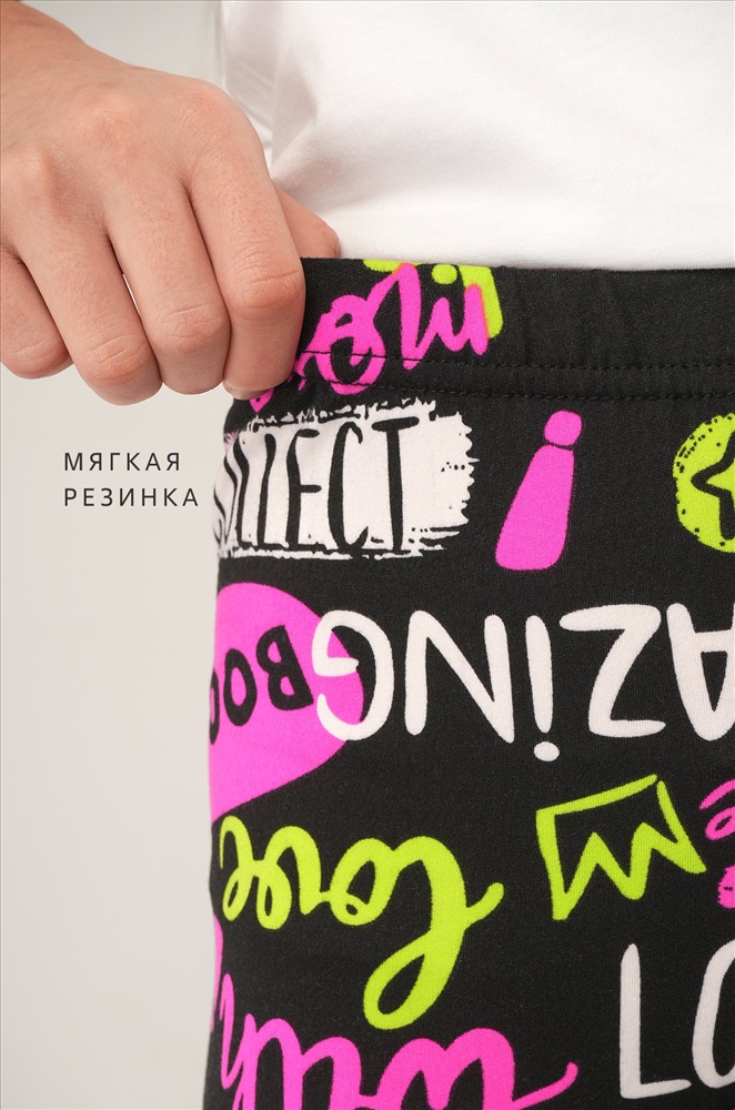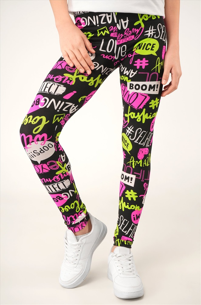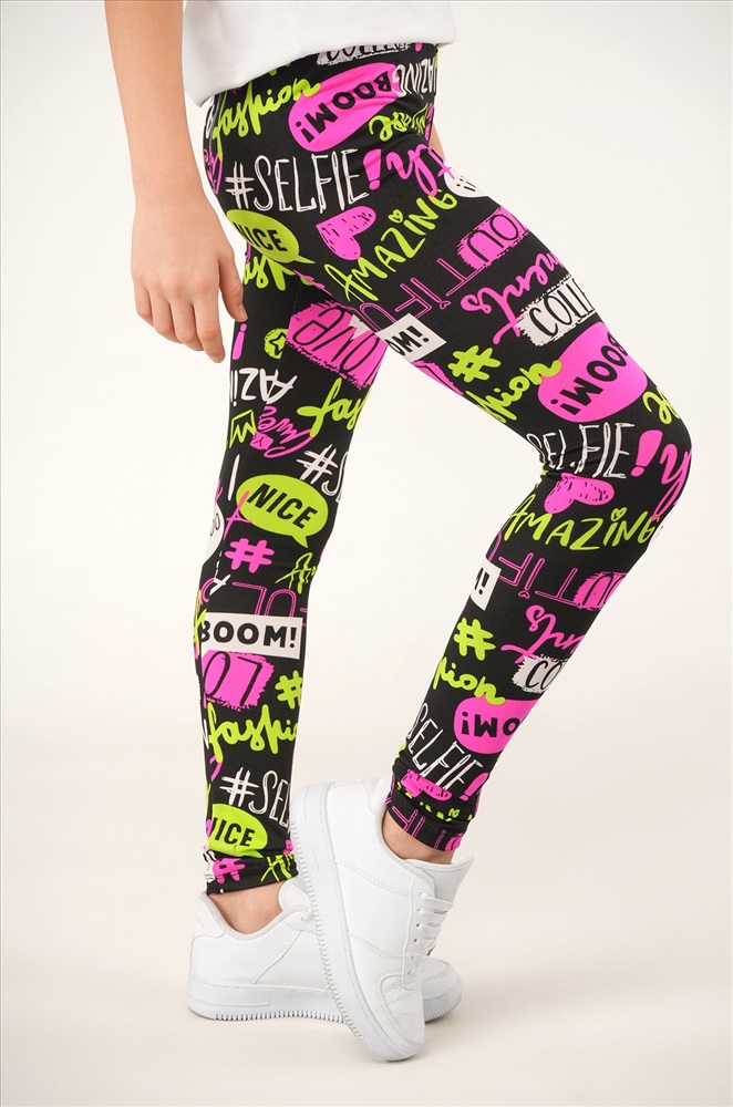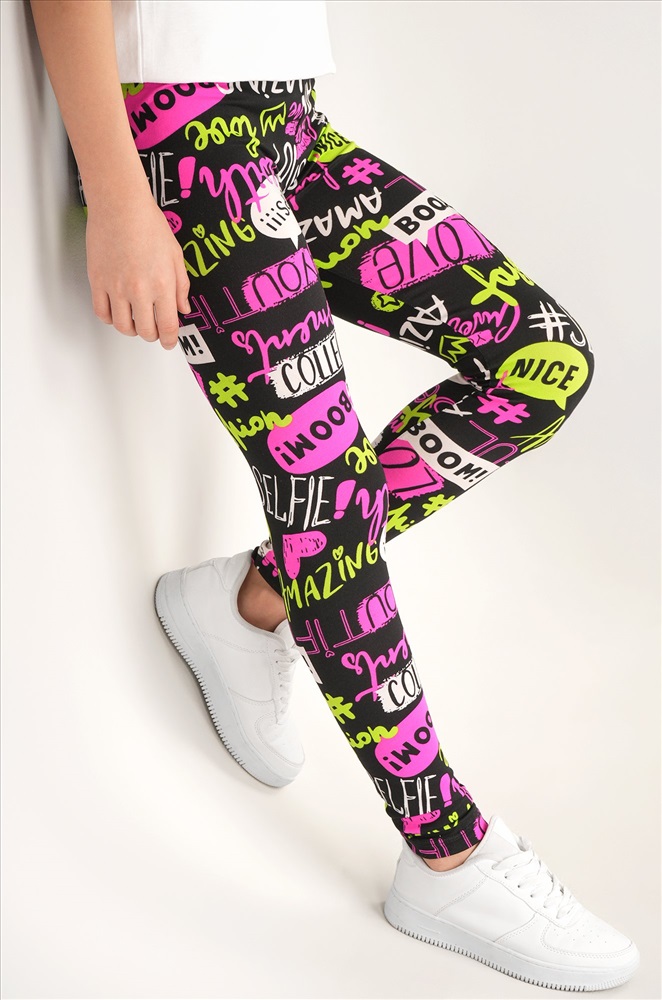 Детские лосины с ярким принтом надписи — то, что нужно для активных будней! Облегающий крой, удобная высокая талия и мягкая резинка — отличные характеристики легинсов для девочки. Модель выполнена из приятной к телу трикотажной ткани бамбук.