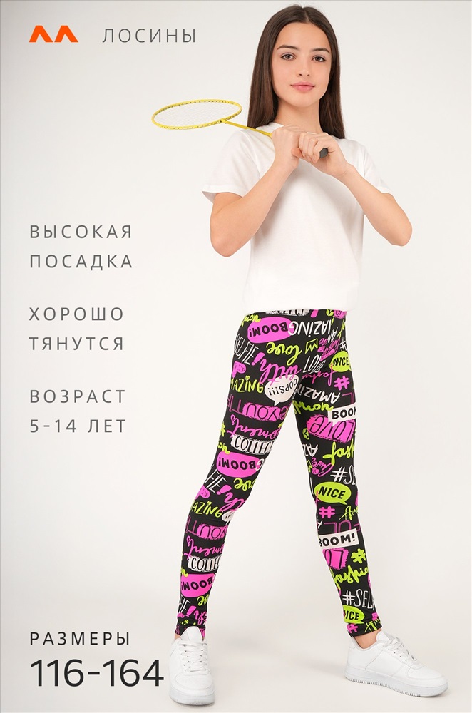 Преимущества: — нежный трикотаж из хлопка с добавлением полиэстера, мягкий и комфортный для активных игр; — удобная посадка благодаря высокой талии и мягкой резинке; — яркий цветной рисунок, который понравится ребенку; — универсальные обтягивающие лосины не стесняют движений; Эластичные тайтсы для спорта и отдыха — в них удобно бегать, прыгать и танцевать. Спортивные штаны станут любимыми для занятий физкультурой, активного отдыха, повседневных прогулок, детского сада и дома — настоящая находка для девочки и подростка!