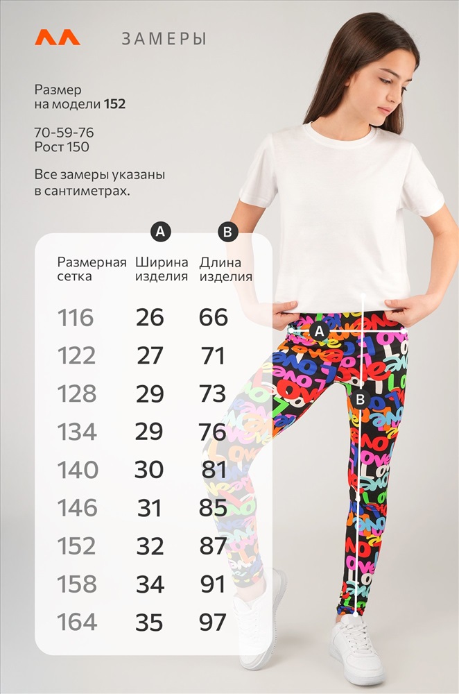 Размер 164: длина внеш. шва: 97 см; длина внут. шва: 71 см; ширина по бедрам: 35 см.