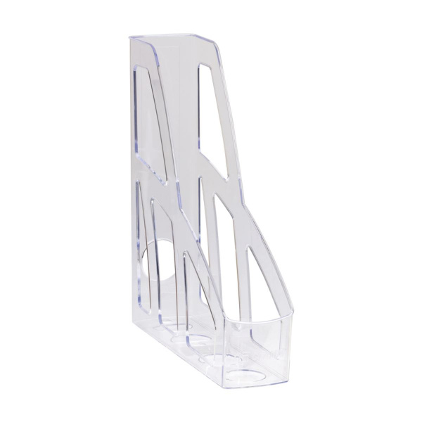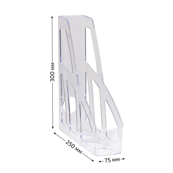Лоток для бумаг вертикальный «СТАММ» серии «Лидер» подходит для хранения бумажной продукции формата А4. Габариты – 300х250х75 мм. Изделие шириной 75 мм вмещает до 600 листов. Имеется отверстие на торцевой части для удобной переноски. Изготовлен из качественного полистирола. Цвет лотка – прозрачный. Оригинальный дизайн, лёгкий, устойчивый и прочный корпус.