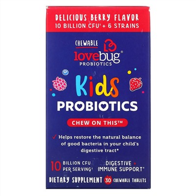 Award-Winning Probiotics for the Whole Family™ История компании LoveBug Эшли Харрис, мама и основательница компании, не смогла найти эффективный и полностью натуральный пробиотик, который облегчил бы колики и проблемы с пищеварением ее сына. Во время беременности у Эшли был обнаружен стрептококк группы B и во время родов в качестве профилактической меры ей давали антибиотики широкого спектра действия. Эти антибиотики убили стрептококк группы B, а также полезные бактерии, которые она должна была передать своему ребенку, чтобы сохранить его здоровье. Пробиотики изменили здоровье ее сына и семьи. Желая поделиться с другими семьями этими знаниями и превосходным пробиотиком, она приступила к серьезным исследованиям, и так родились пробиотики LoveBug! † На момент производства. Рекомендации по применениюПринимать по 1 жевательной таблетке в день до еды. ИнгредиентыКсилитол, натуральные ароматизаторы, микрокристаллическая целлюлоза, стеариновая кислота, корень свеклы (краситель), гидроксипропилцеллюлоза, яблочная кислота, лимонная кислота, стеарат магния, диоксид кремния. ПредупрежденияОпасность удушения. Предназначено только для детей старше 3 лет. Применять только под присмотром взрослых. Хранить в недоступном для детей месте. Примечание. Всегда консультируйтесь с педиатром, перед тем, как давать ребенку пищевые добавки. Не использовать, если защитная пленка отсутствует или повреждена.