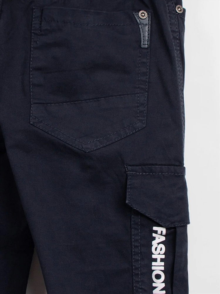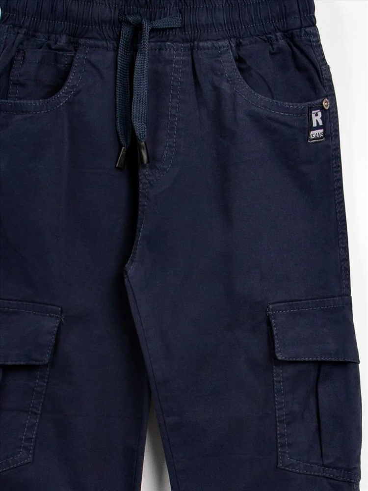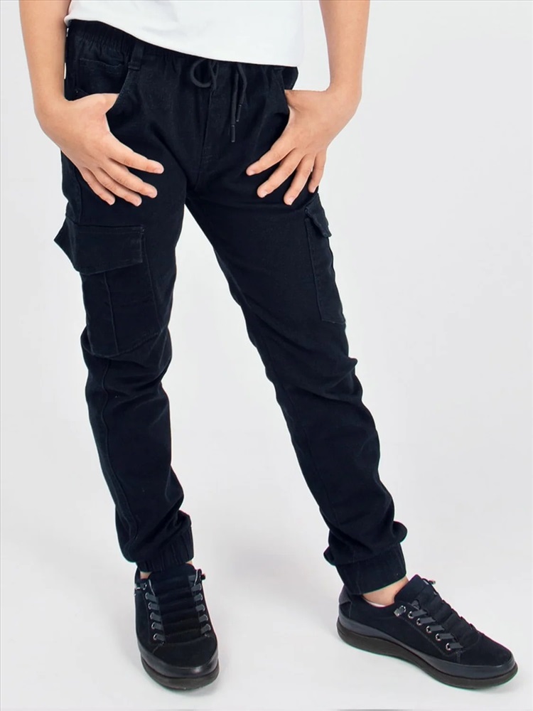 Детские джоггеры из прочного денима. Пояс широкий и эластичный, по низу штанин эластичные манжеты, удобные боковые и задние карманы.