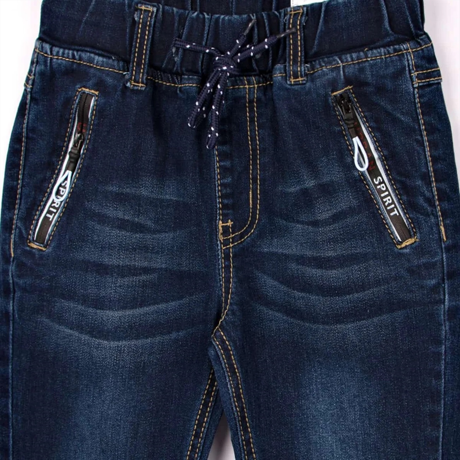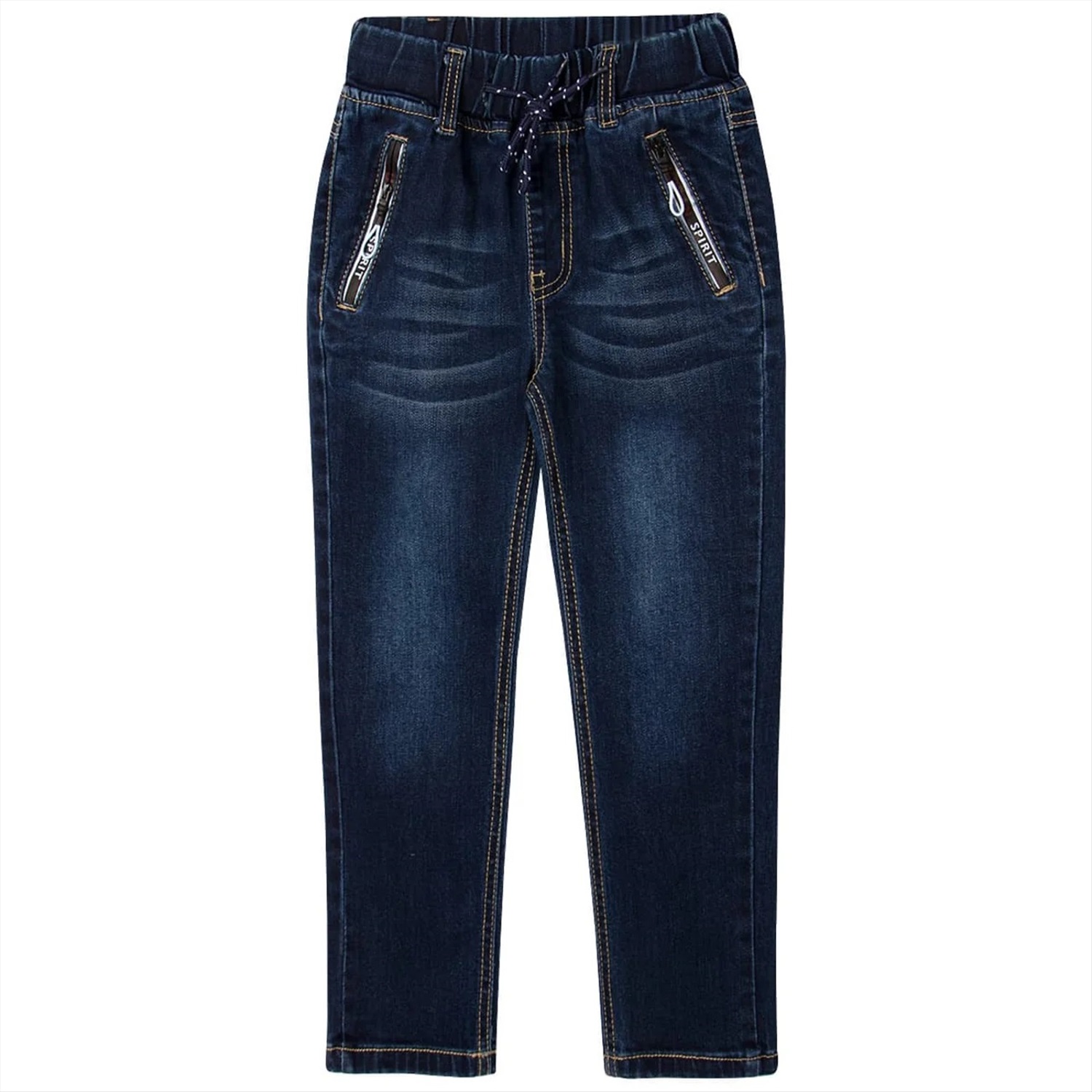 Классические джинсы для мальчика. По бокам карманы, удобные, вместительные, на молнии. На штанинах затирание цвета и имитация потертости. Внутри пояса шнурок, позволяющий регулировать обхват талии.