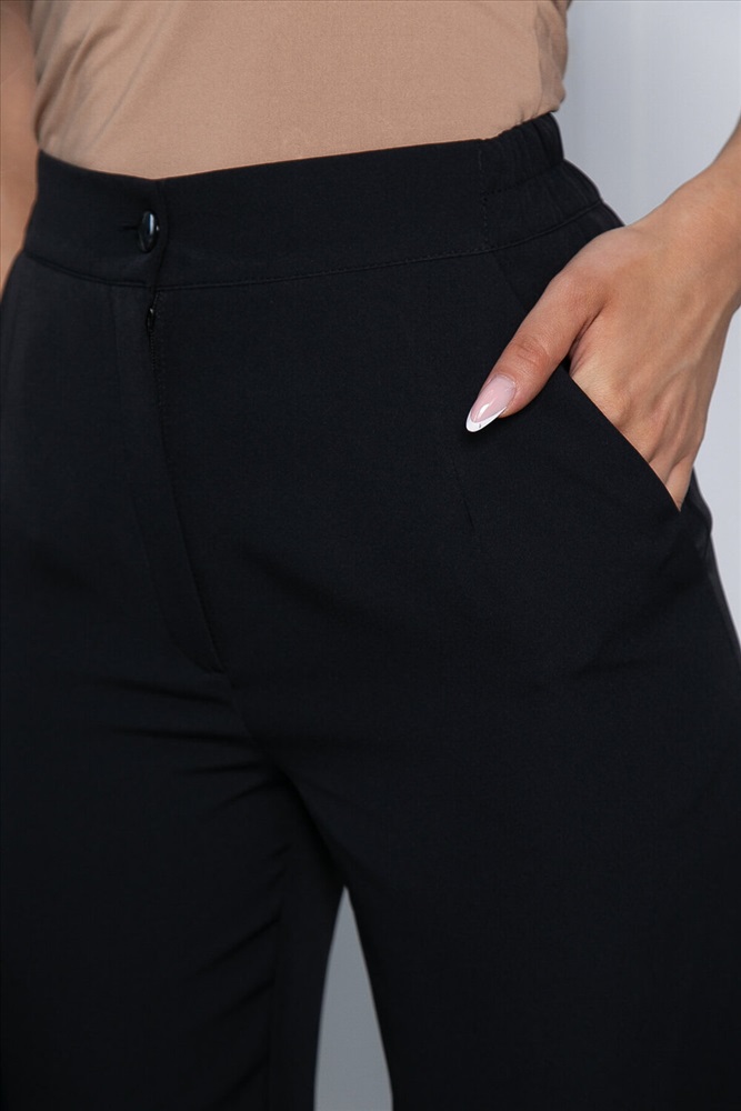 Классические брюки в базовом чёрном цвете подойдут для создания комфортного офисного и повседневного образа. Они не сковывают движений и выглядят стильно и лаконично. С брюками такого оттенка получатся стильные образы, которые будут уместны, как в повседневной жизни, так и на деловой встрече. Сзади у брюк есть резинка, карманы расположены по бокам.