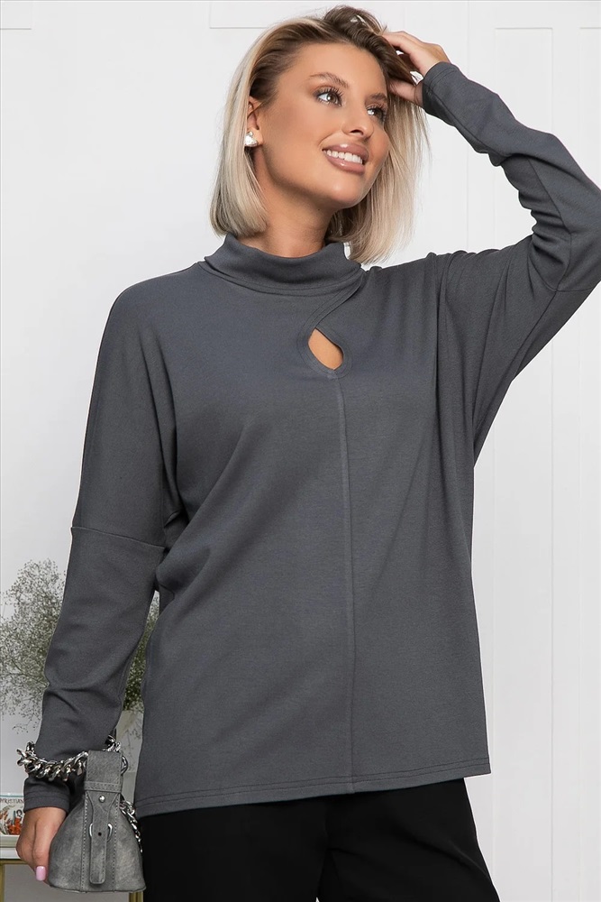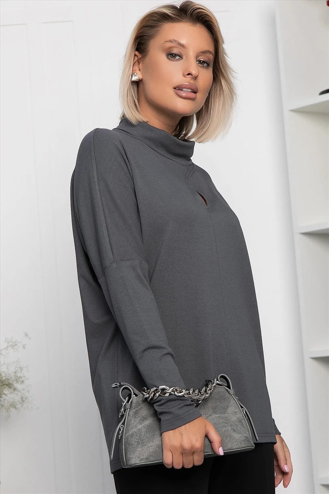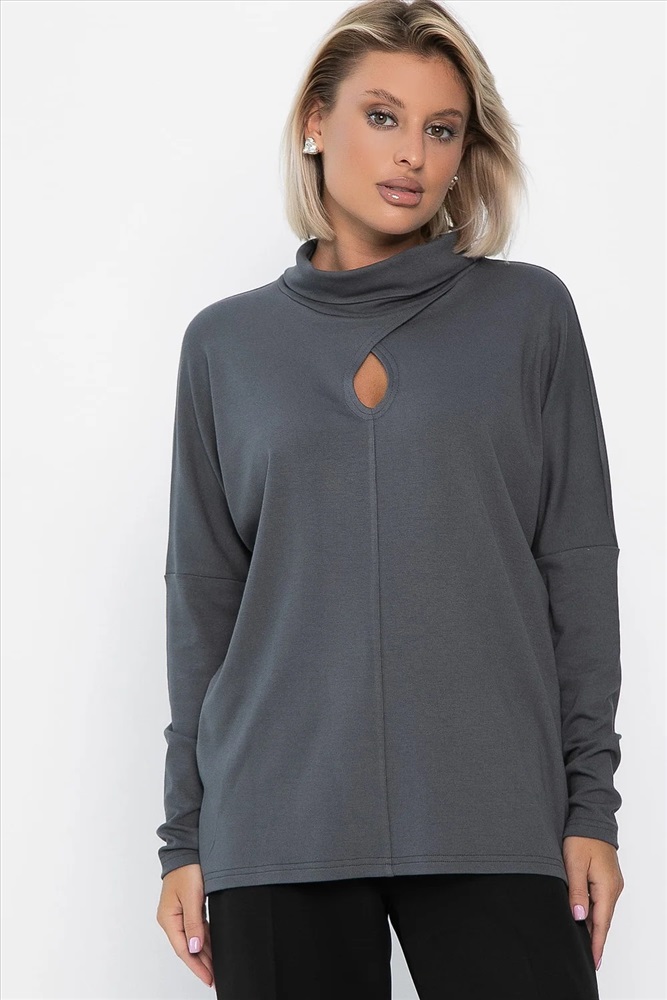 Разнообразьте свой гардероб стильным джемпером в графитовом цвете, который станет универсальным элементом вашего образа. Изготовленная из мягкого вязаного трикотажа, она обеспечит вам комфорт на протяжении всего дня. Джемпер имеет спущенные рукава и горловину в форме хомута. Каплевидный вырез привлекает внимание, придавая образу изысканности. Эта модель станет основой для создания разнообразных стильных образов. Она идеально подходит для прохладных вечеров и осенних прогулок, и непременно займёт почётное место в вашем гардеробе.