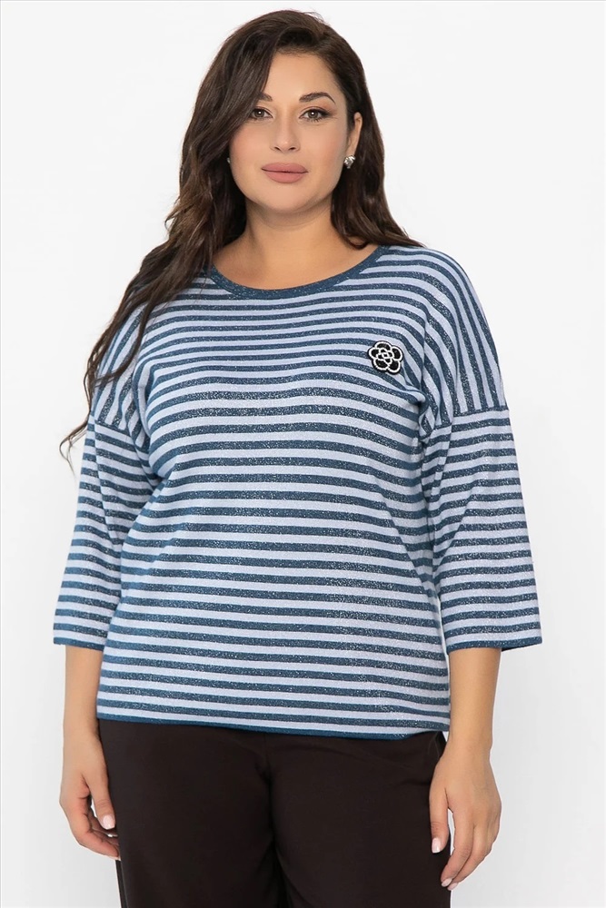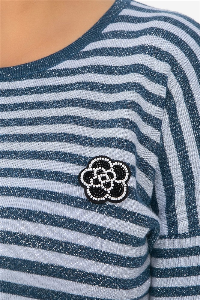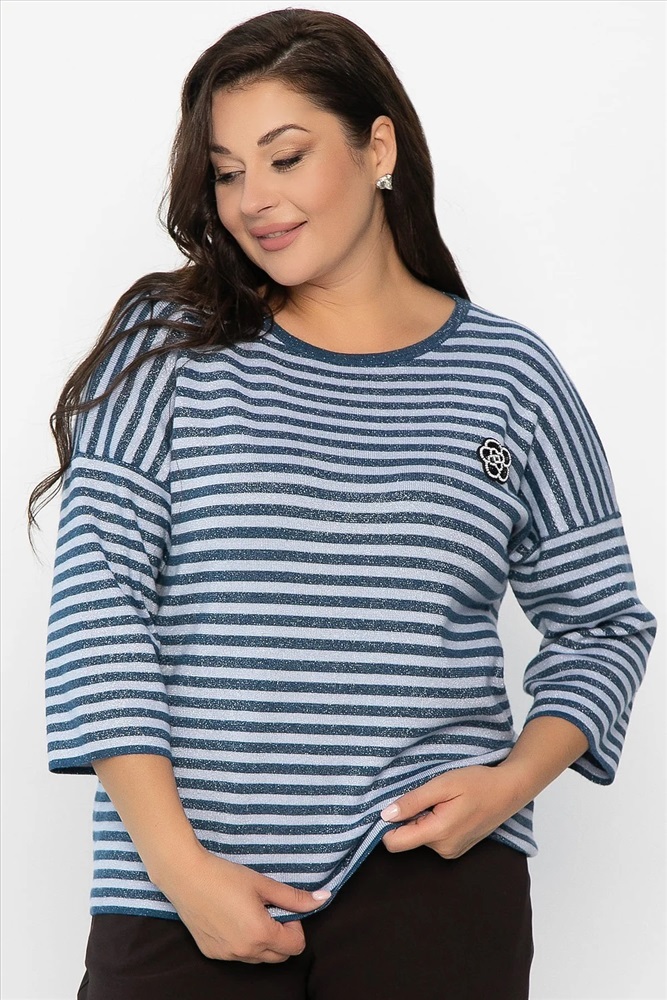 Универсальный джемпер с классическим полосатым принтом станет незаменимым элементом гардероба. Он изготовлен из трикотажа с добавлением люрекса, что придает ему особый шарм. На груди пришита небольшая аппликация из бисера, которая добавляет образу изюминку и завершенность. Этот джемпер идеально подходит для создания повседневных образов, сочетая в себе комфорт и современный стиль.