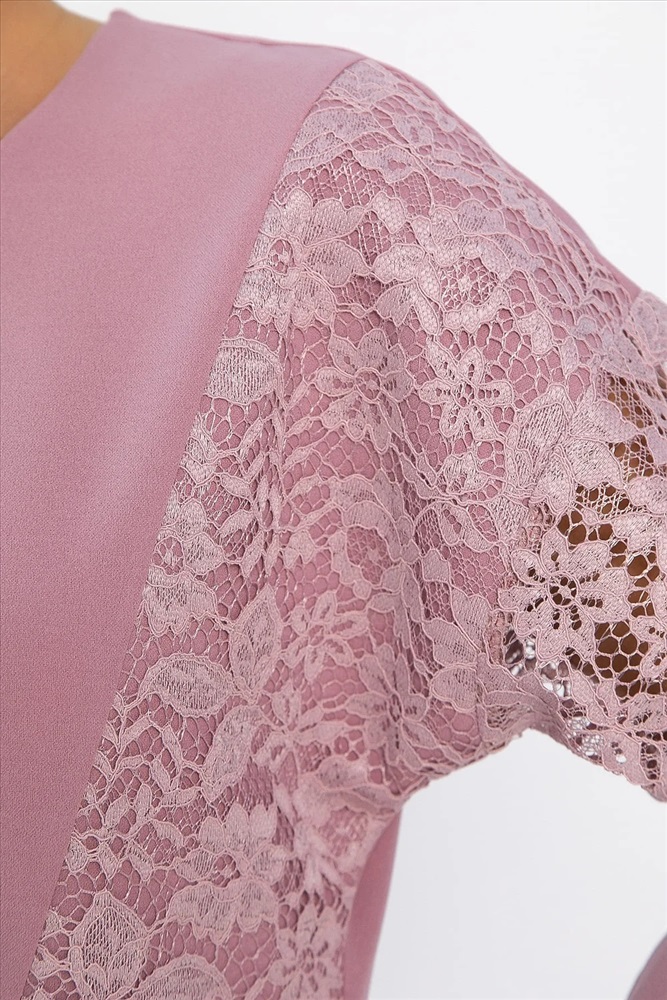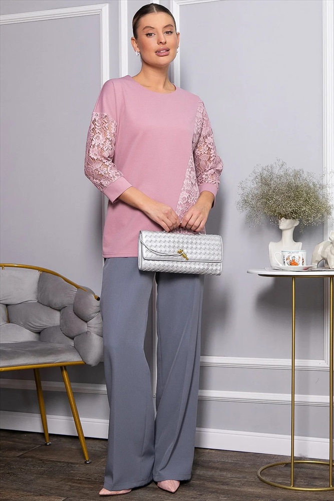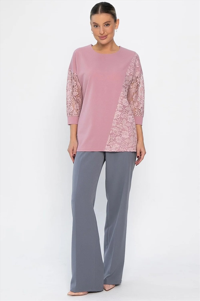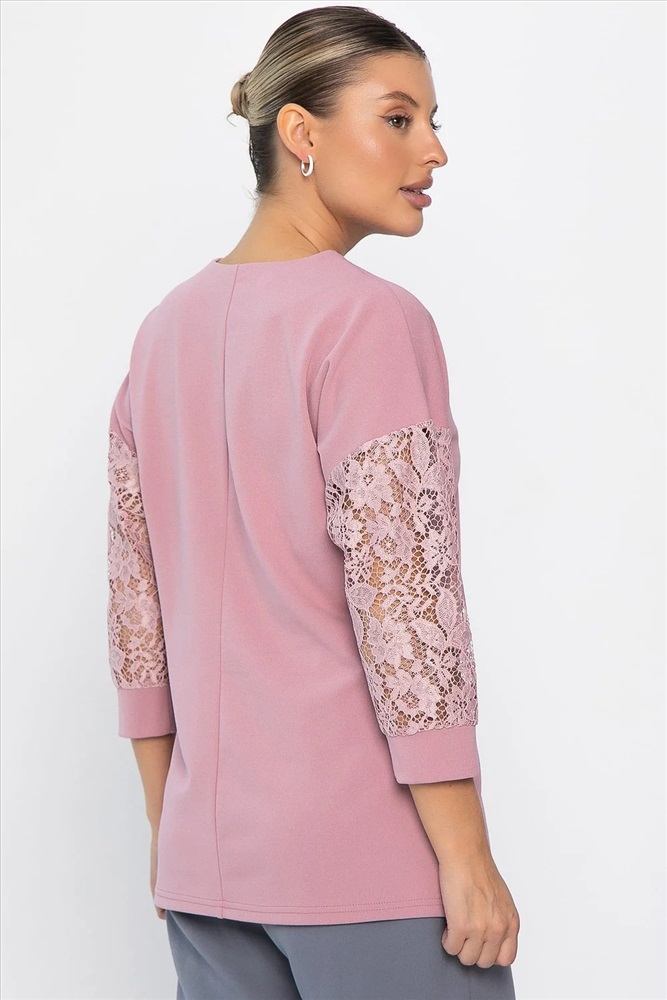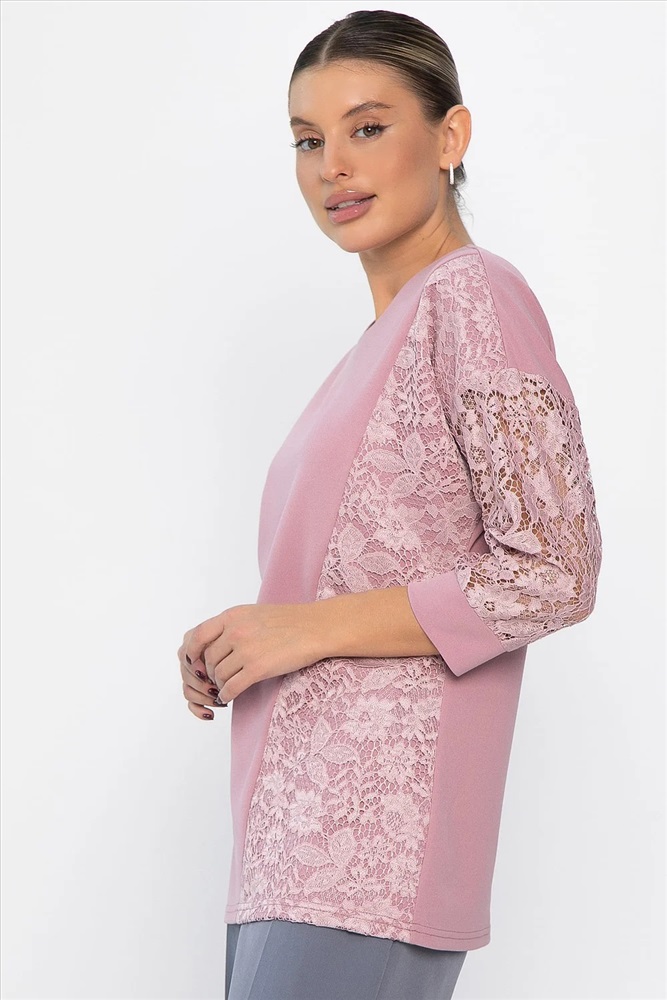 В вашем гардеробе прекрасно будет смотреться трикотажный джемпер свободного кроя в розовом цвете. Простой и лаконичный силуэт этой модели отлично сочетается с любой базовой одеждой. Свободный крой деликатно скрывает недостатки фигуры. Джемпер имеет втачной рукав со спущенной линией плеча и длину 3/4. Контрастный акцент в изделии создают кружевные вставки.