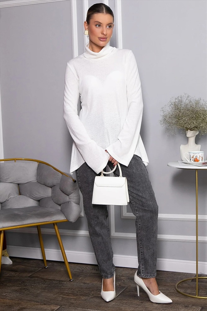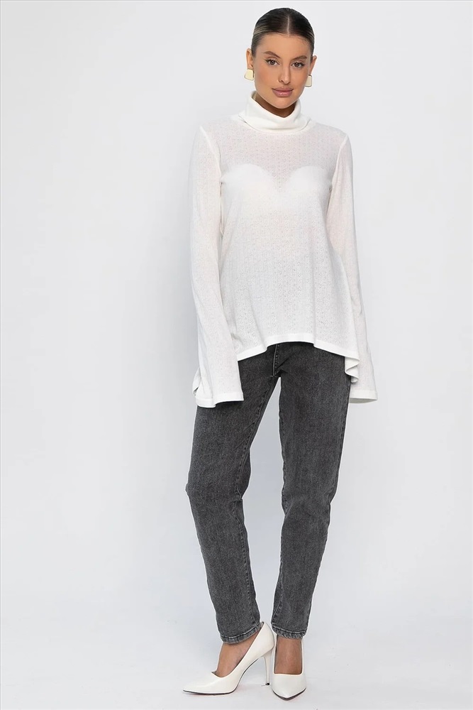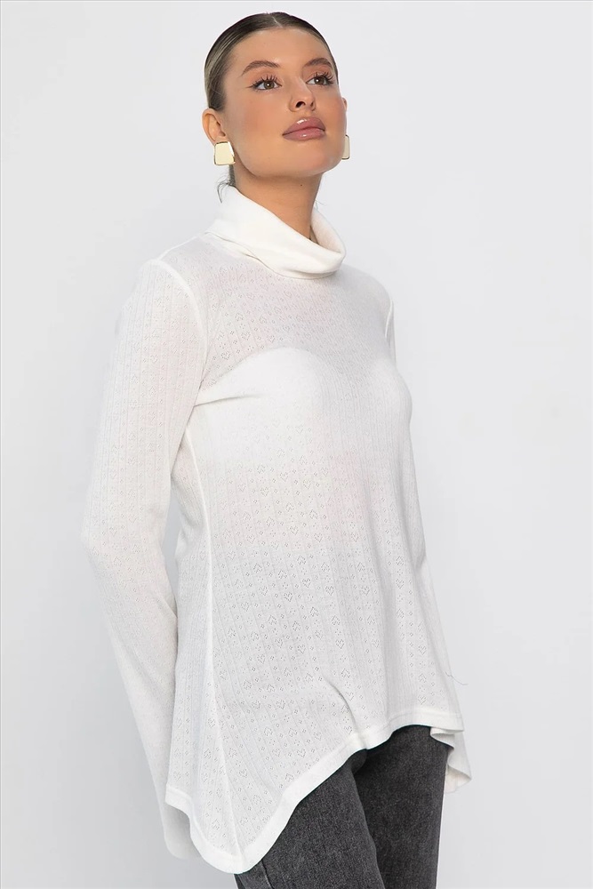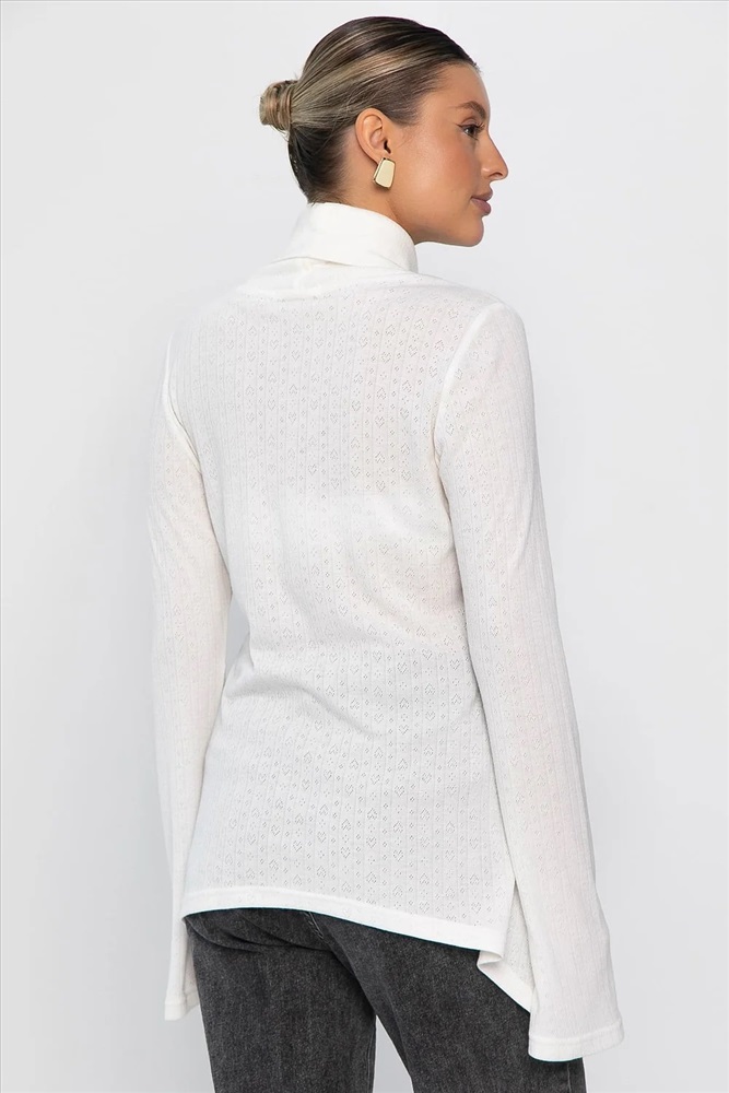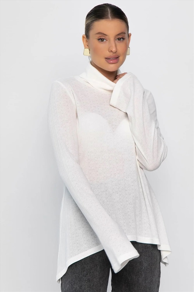 Ажурный трикотажный джемпер — идеальный выбор для создания стильных повседневных образов. Модель с втачным удлиненным рукавом и воротником-хомутом придает современный силуэт. Асимметричный крой низа, с удлинением от центра к бокам, добавляет оригинальности. Ткань с перфорацией в виде сердечек придает образу нежность и романтичность. Создайте модные и комфортные образы с нашим новым джемпером!