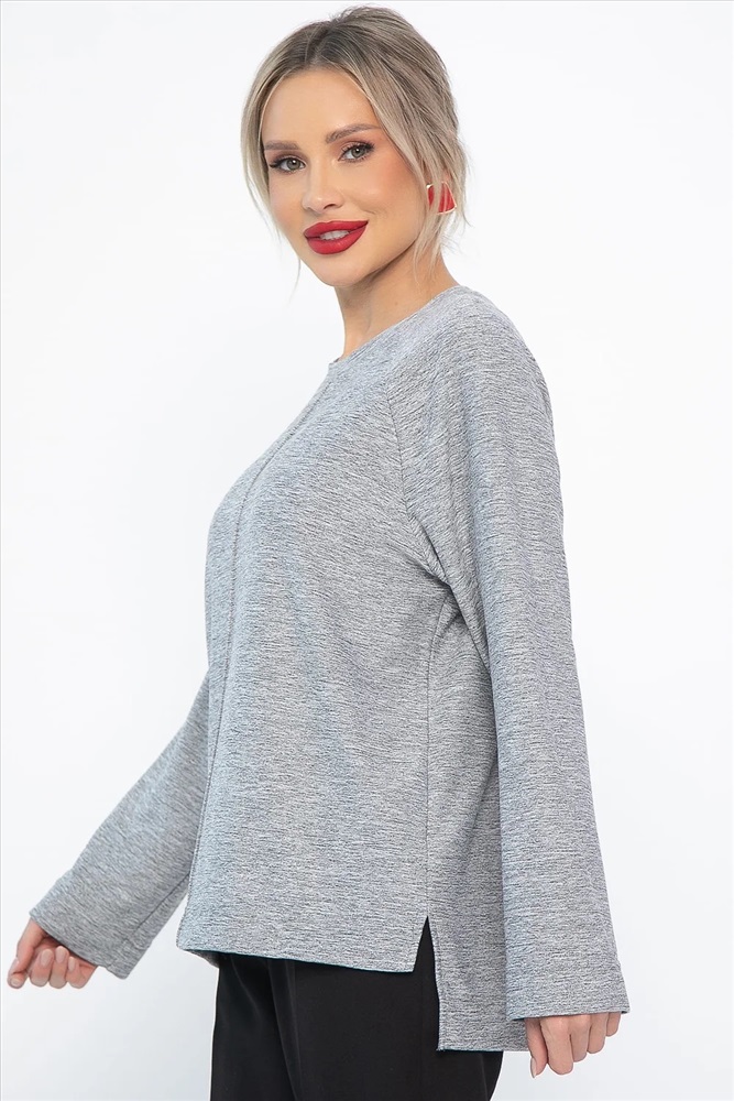 Серый трикотажный джемпер асимметричного кроя — это неотъемлемая часть базового гардероба, которая добавляет вашему образу элегантности и актуальности. Эта модель объединяет в себе простоту однотонного дизайна и современные тенденции, создавая удобные и стильные комплекты. Особое внимание уделено деталям: удлинённая спинка придаёт изделию интересный визуальный эффект, а боковые разрезы обеспечивают комфорт и динамику. Передняя часть джемпера украшена тонкой строчкой шириной 1 мм, что подчёркивает внимание к деталям.