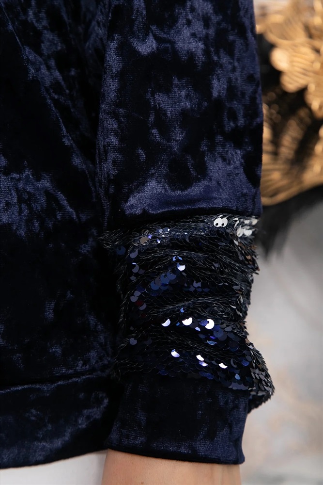 Этот изысканный джемпер из качественного трикотажного бархата создает ощущение роскоши и элегантности. Его уникальность подчеркнута идеальной посадкой по фигуре, которая подчеркивает все достоинства силуэтов. Отличительная особенность модели — это эффектные вставки из блестящих пайеток на рукавах, добавляющие динамизм и праздничность образу. Идеально подходит как для вечерних выходов, так и для особых случаев, когда хочется выглядеть особенно стильно и элегантно.