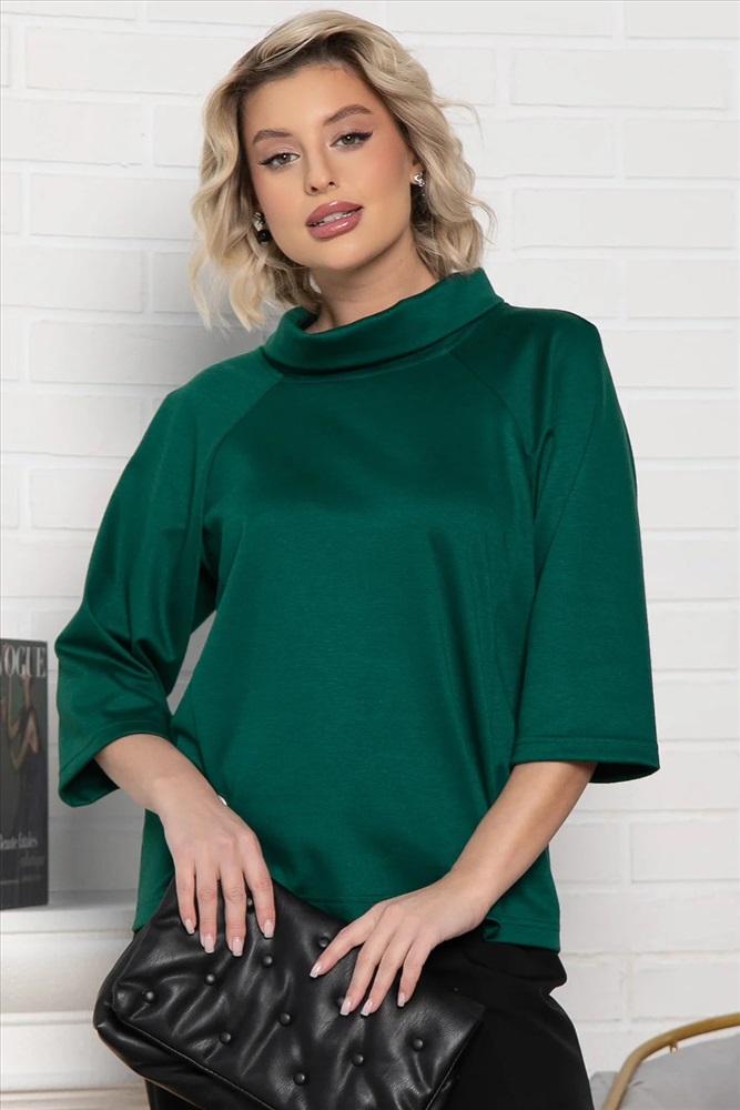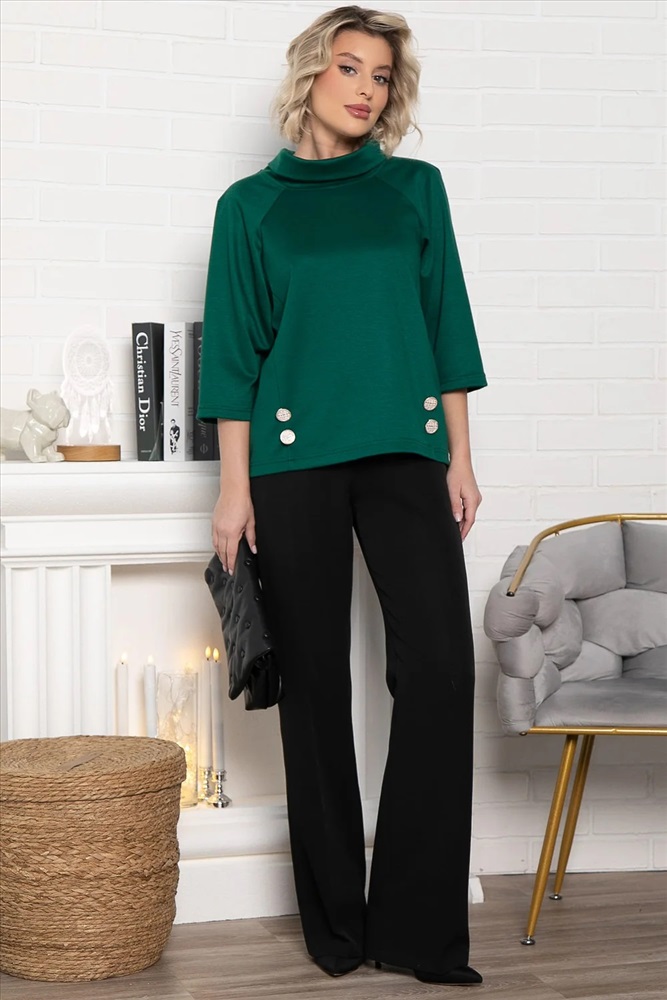 Джемпер прямого кроя в изумрудном оттенке с воротником-хомутом идеально подходит для создания стильного и удобного образа. Декоративные пуговки на передней части джемпера придают ему изящный и привлекательный вид. Подойдет как для повседневной жизни, так и для более формальных мероприятий. Он идеально сочетается с разными стилями и аксессуарами, позволяя создать уникальный и стильный образ. Рукав-реглан средней длины 3/4.