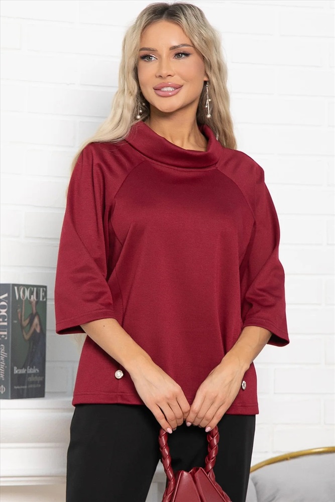 Джемпер прямого кроя в бордовом цвете с воротником-хомутом идеально подходит для создания стильного и удобного образа. Декоративные пуговки на передней части джемпера придают ему изящный и привлекательный вид. Подойдет как для повседневной жизни, так и для более формальных мероприятий. Он идеально сочетается с разными стилями и аксессуарами, позволяя создать уникальный и стильный образ. Рукав-реглан средней длины 3/4.