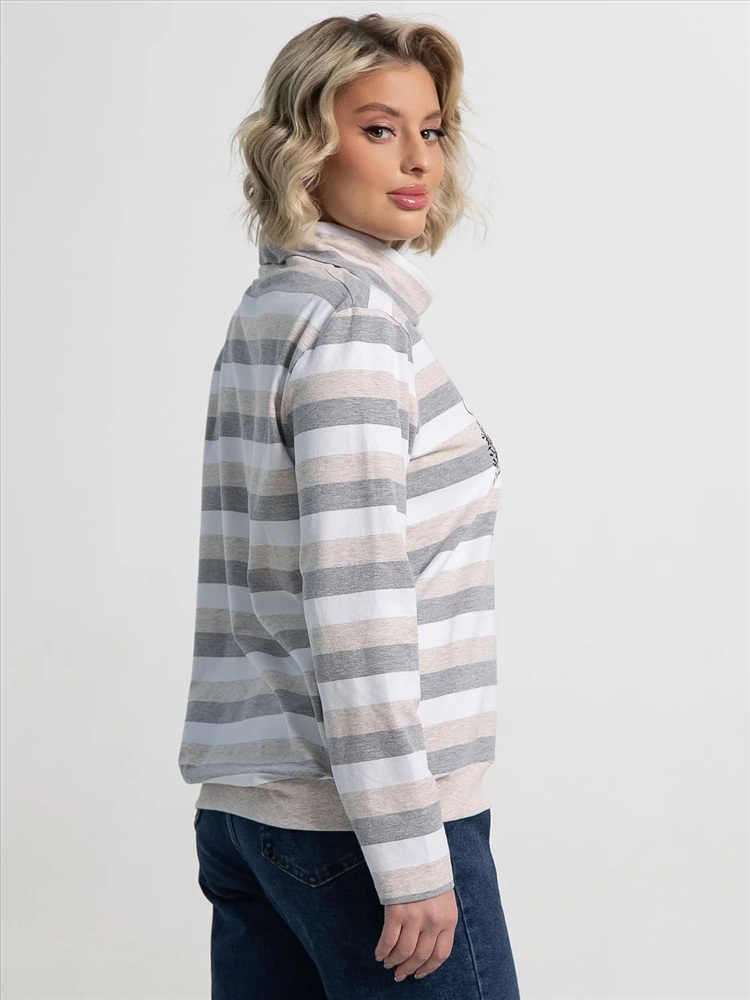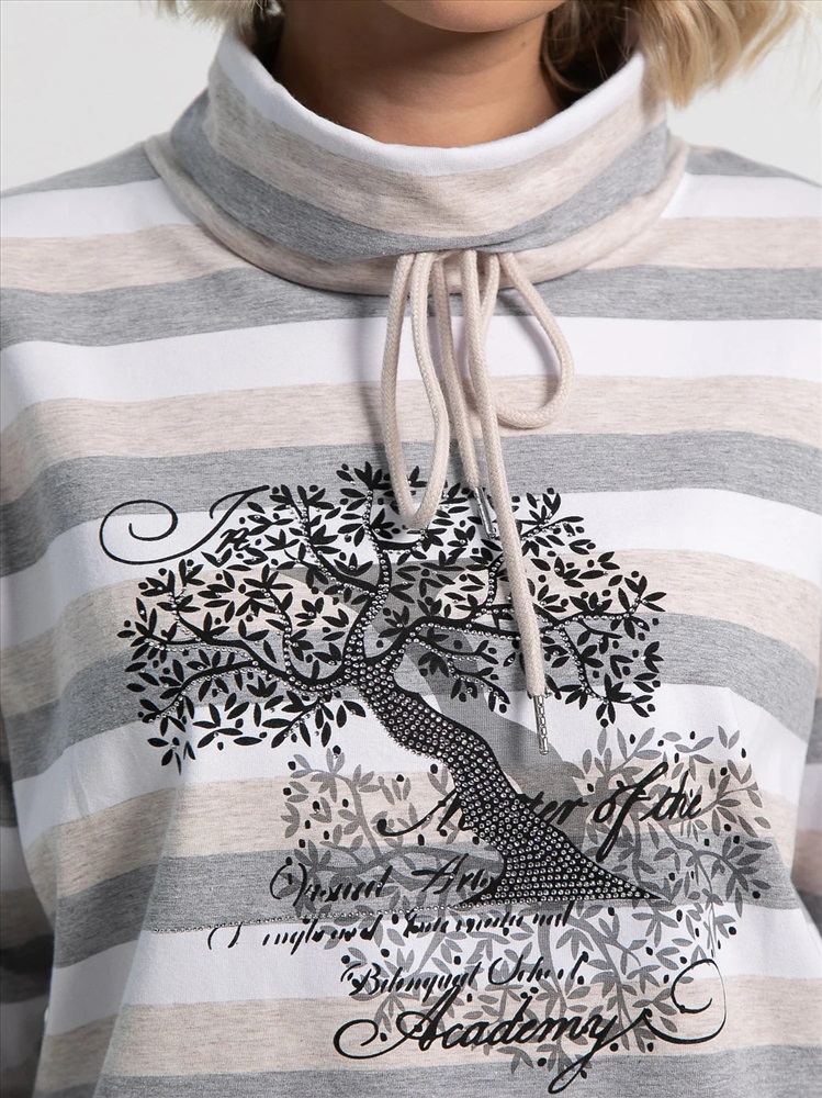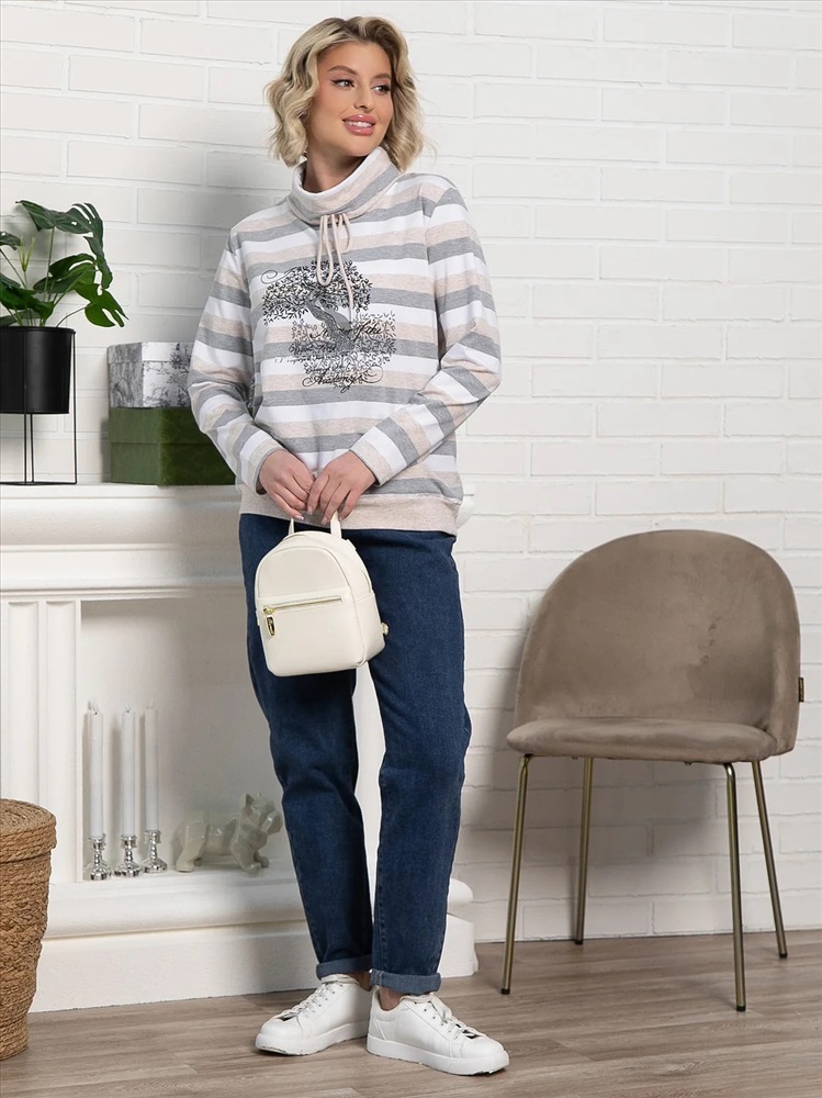 Бело-серый джемпер в полоску станет отличным выбором для создания стильных и комфортных образов. Горловина оформлена воротником-хомутом со шнурком. На передней части изделия нанесена фотопечать в форме дерева и украшена стразами, что придаёт ему выразительный акцент. Низ джемпера оформлен широкой резинкой в тон основной ткани, обеспечивая идеальную посадку и завершённый силуэт. Этот джемпер станет отличным дополнением к вашему гардеробу, придавая ему элегантность и уникальность.