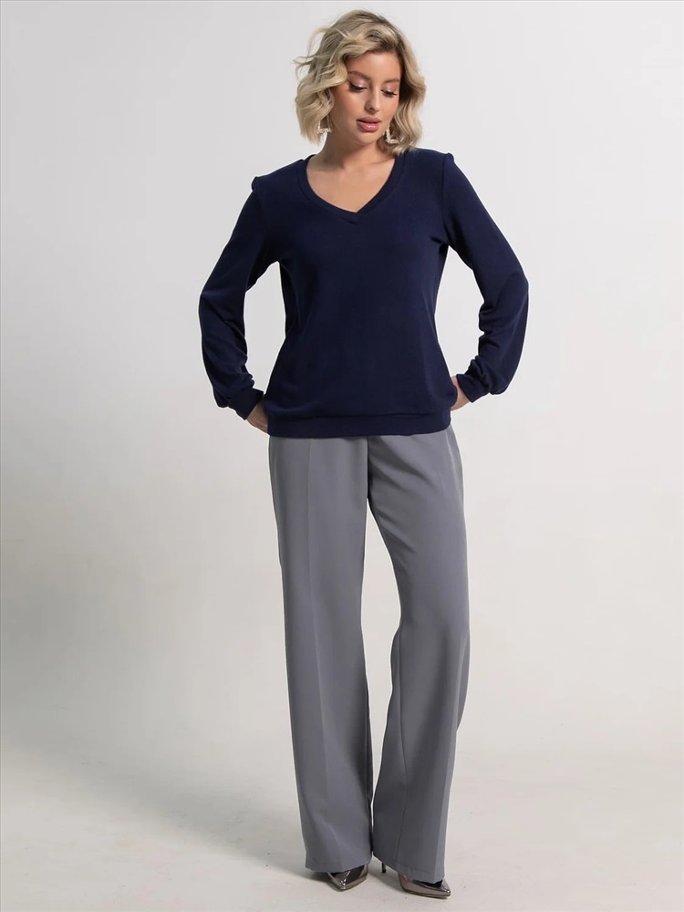 Великолепный джемпер в изумительном синем цвете, с вырезом на груди, манжетами на рукавах и поясе. Идеально подойдет с брюками, джинсами и юбкой.