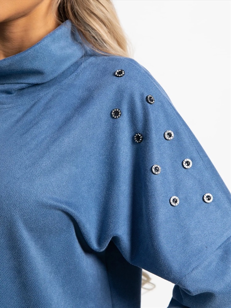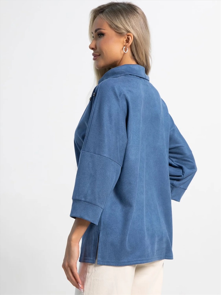 Для тех, кто предпочитает комфорт и современный дизайн, этот женский джемпер станет отличным выбором. Он идеально впишется в повседневные образы и подчеркнёт вашу уникальность. Укороченный рукав с манжетом обеспечивает удобство и стильный вид. Джемпер имеет спущенное плечо, а прямой низ с разрезами по бокам придаёт ему особую динамичность и комфорт. В данной модели одно плечо украшено пуговицами. Воротник-хомут добавляет изысканности.