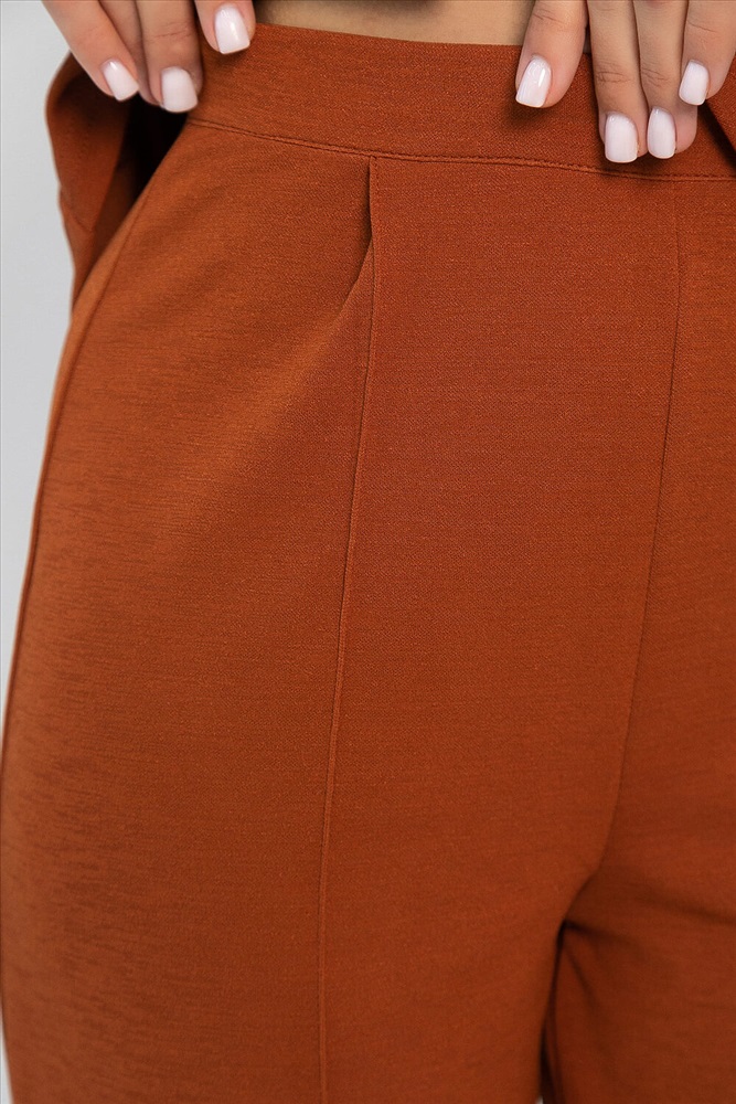 Стильный женский костюм на каждый день в терракотовом цвете. Уверены, вы по достоинству оцените это универсальное базовое сочетание — джемпер и брюки. Женский брючный костюм пошит из трикотажной ткани. В составе костюма — лаконичный женский джемпер и широкие брюки-палаццо. Кофта имеет округлый вырез горловины с обтачкой, спущенную линию плеча, втачные рукава. Верх дополняют широкие брюки прямого кроя с притачным поясом. Штаны имеют удобную высокую посадку, которая подойдет даже для беременных. Трикотажный костюм представлен в широкой размерной сетке, а оверсайз-крой обеспечивает свободу движений.