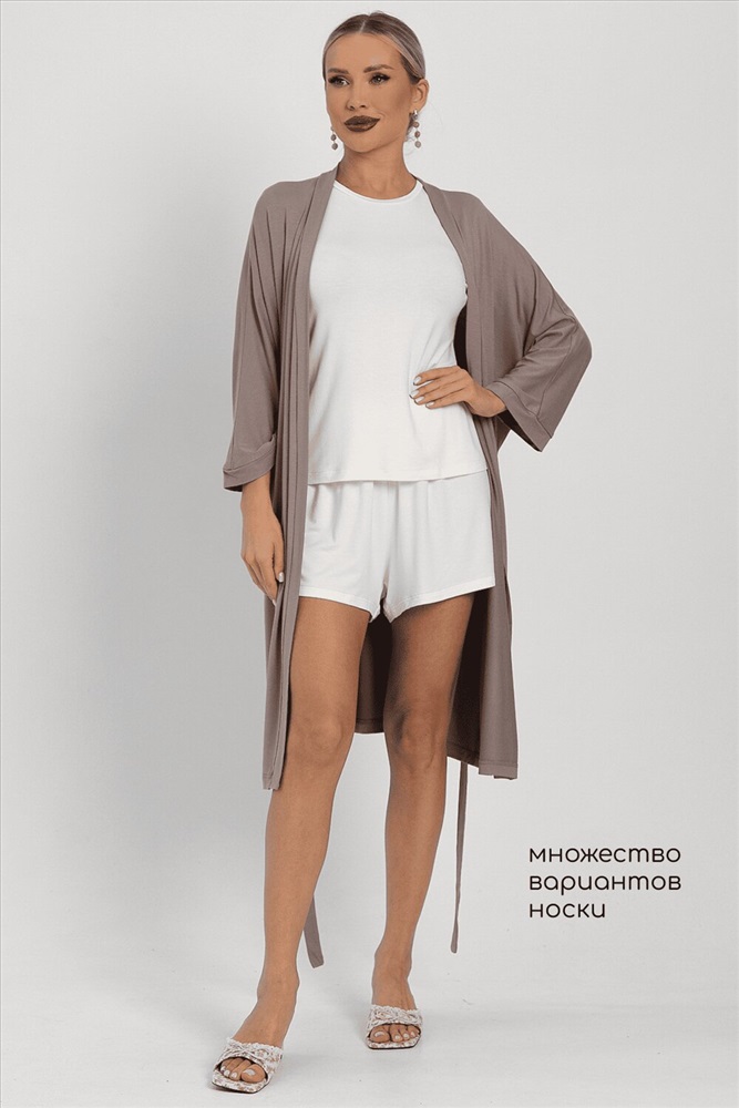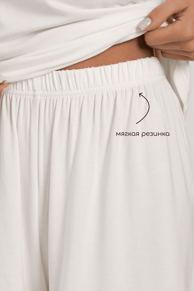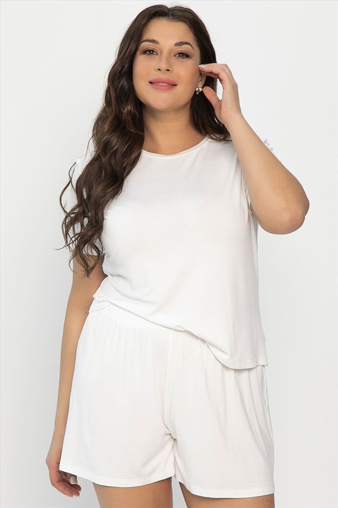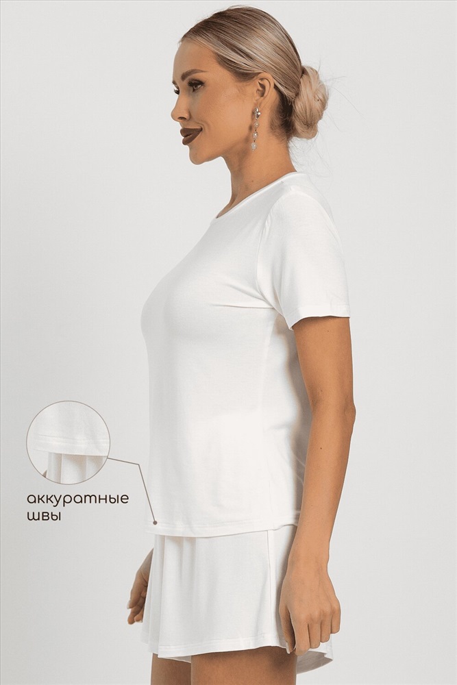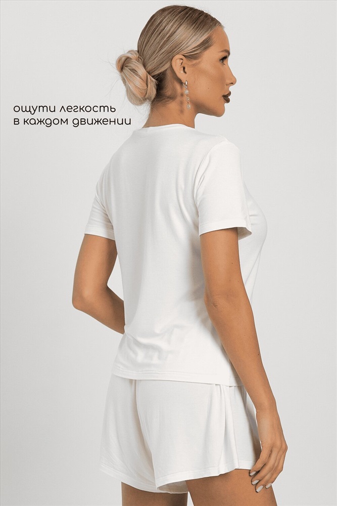 Костюм женский для дома, обеспечивающий максимальный комфорт, состоит из футболки и шорт. Футболка выполнена в свободном крое с короткими рукавами, шорты тоже свободные, с резинкой на талии. Этот комплект можно использовать как для сна, так и в качестве уютной домашней одежды.