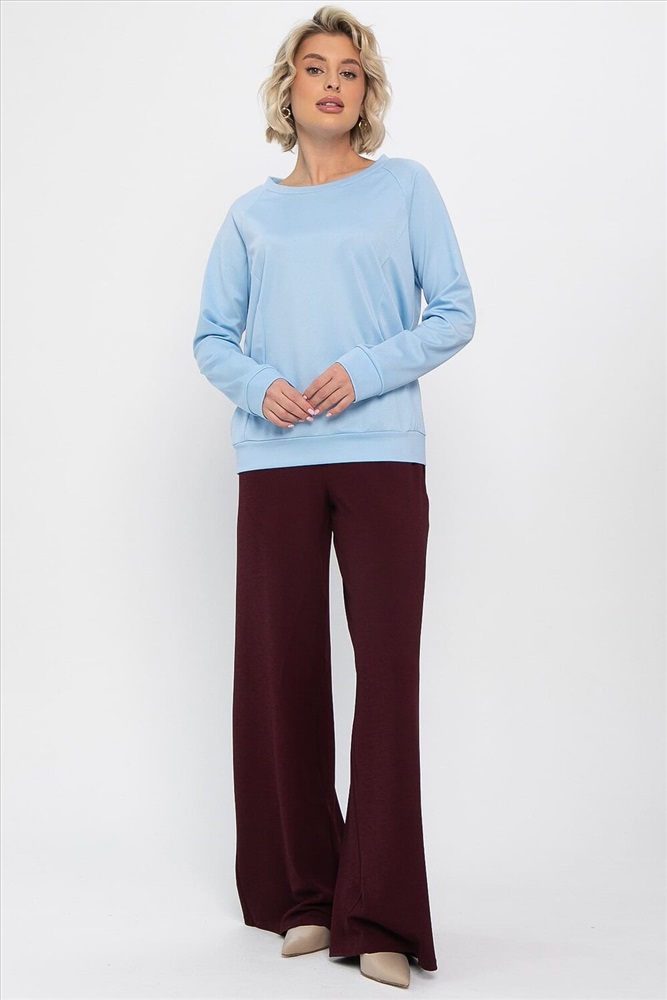 Этот женский трикотажный костюм свободного кроя — идеальный выбор для повседневного ношения! Он сочетает комфорт и стиль, подходя для любых ситуаций. Верхняя часть выполнена в нежном голубом цвете, который добавляет свежести и живости образу. Брюки имеют элегантный бордовый оттенок, придающий глубину и выразительность. Брюки оснащены удобной молнией, облегчающей ношение, а верхняя часть без застёжек делает костюм ещё более комфортным для повседневного использования.