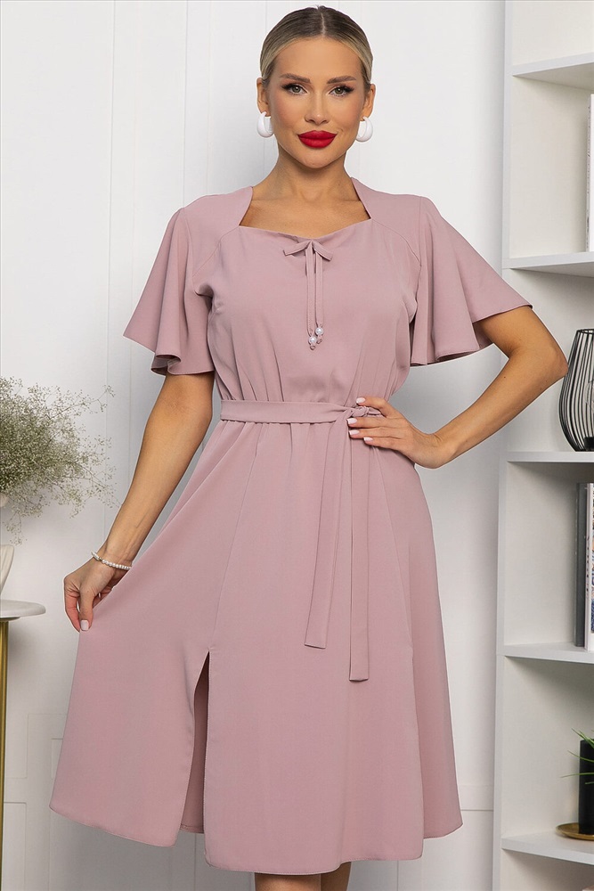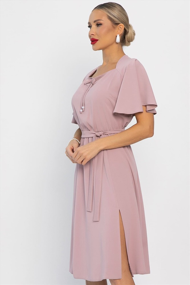 Платье из струящейся ткани в пудровом цвете приталенного силуэта. Кареобразный вырез изящно подчеркивает линию декольте. Юбка клешенная с двумя разрезами спереди. В таком платье вы точно будете в центре внимания. Оно достаточно сдержанно, но в то же время наполнено акцентными деталями, что идеально подчеркнет вашу красоту. Изделие имеет декоративный бантик с жемчугом. По талии на резинке.