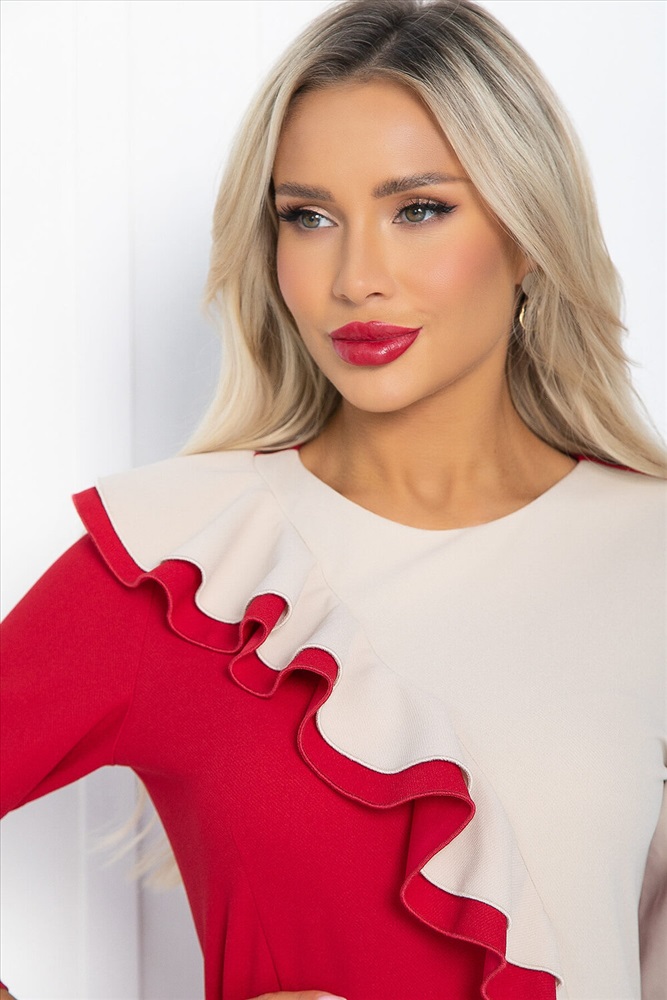 Роскошное платье, спереди комбинированное из двух цветов создающая свою уникальность, за счет двойного волана на лифе. Модель имеет рукава 3/4 и может стать достойным повседневным нарядом на осень и зиму для девушек, любящих выглядеть элегантно в любой ситуации – на вечеринке и на работе.